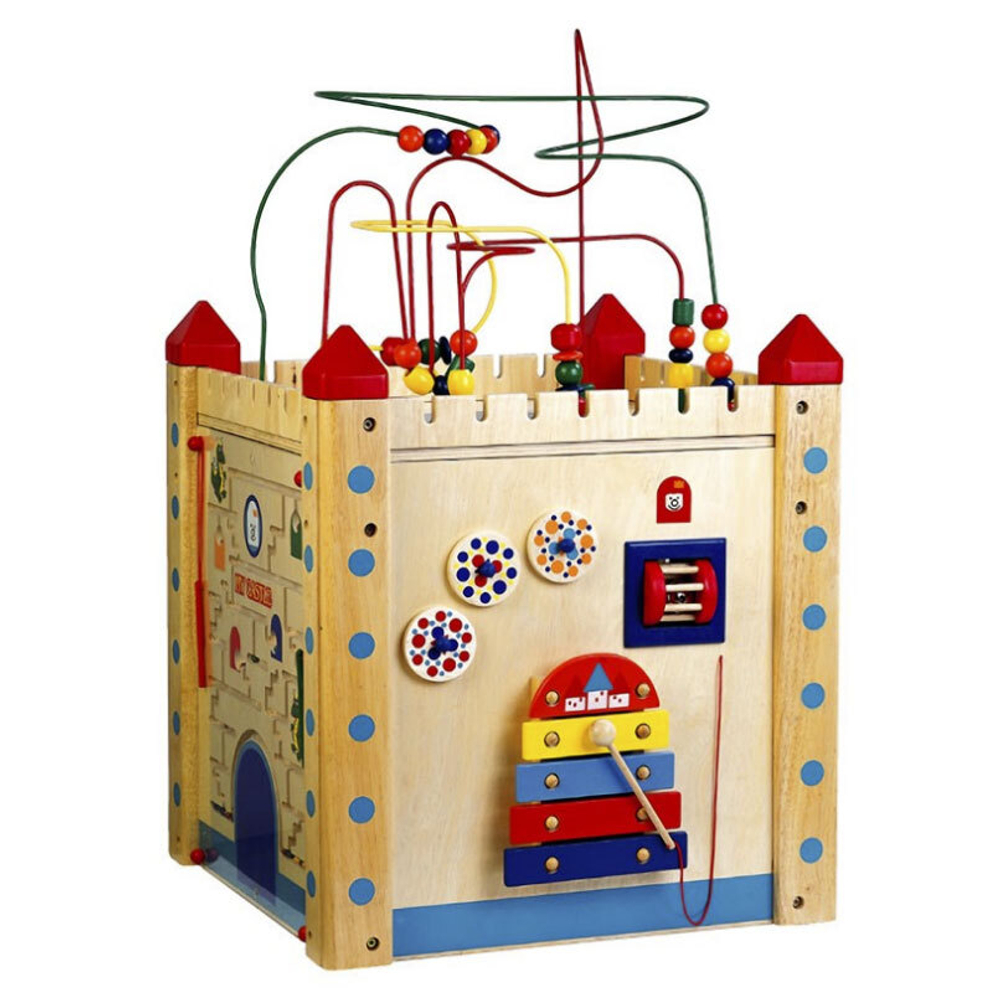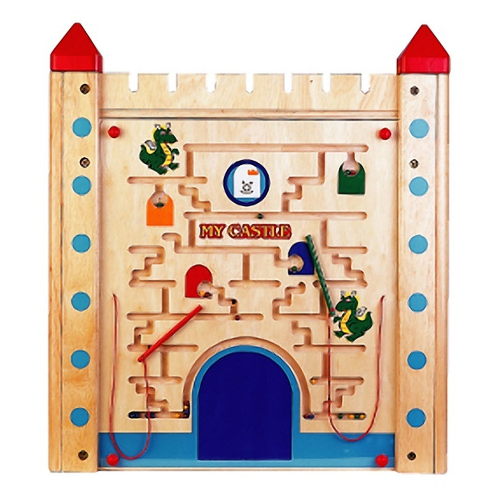 На трех сторонах этого замка лабиринты, в которых основной игровой элемент закреплен в желобке сложной формы, на четвертой стене закреплены музыкальные инструменты (металлофон, барабан с колокольчиками) и визуальные элементы - цветные колесики.