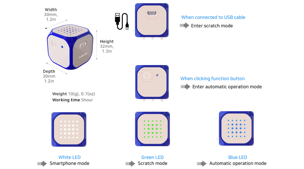 Электронный конструктор Cubroid состоит преимущественно из кубиков с длиной ребра в среднем 3 см (или больше в зависимости от назначения). Включающих в себя “рабочие модули” и аксессуары: кубики-передатчики, пассивные кубики для придания игрушке формы и пару колес. При этом каждый кубик-“рабочий модуль” является достаточно сложным устройством – со своим функциональным чипом, Bluetooth модулем и подзаряжаемым через USB кабель встроенным аккумулятором.