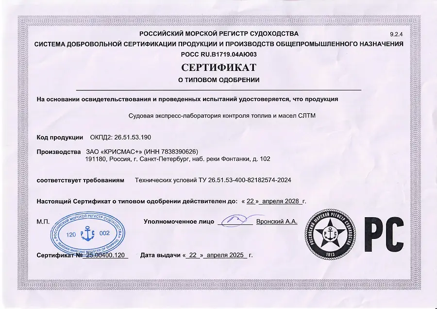 Cудовая экспресс-лаборатория контроля топлив и масел СЛТМ-1, разработанная и производимая ЗАО «Крисмас+», широко и успешно применяется инженерно-техническими работниками, а также младшим обслуживающим персоналом (механики, техники, лаборанты) для химического контроля качества топлив отечественных и зарубежных производителей для судов флота и аналогичных типов, масел циркуляционных цилиндровых для дизелей (разной степени отработанности), масел турбинных, картерных, гидравлических, трансформаторных и пр. при эксплуатации силовых и энергетических установок на судах и береговых объектах.