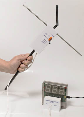 Модуль «ЭЛЕКТРОМАГНИТНОЕ ПОЛЕ» соединен проводом с индикатором, к которому можно подсоединять съемные антенны в зависимости от диапазонов измерений. На задней панели измерительного блока расположен магнитный держатель, позволяющий крепить блок к магнитной доске.