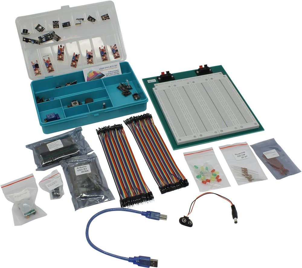 Посмотрели? Не надо ни в чем убеждать тех, кто знает, как трудно найти в магазинах половину того, что здесь есть – от дисплея (тот самый, весьма популярный 1602) до термометра, датчика Холла или датчика пульса. Cорок модулей, подключаемых к Arduino, книга Знаний с проектами и большая макетная плата (рабочий стол) с проводами и кабелем USB.