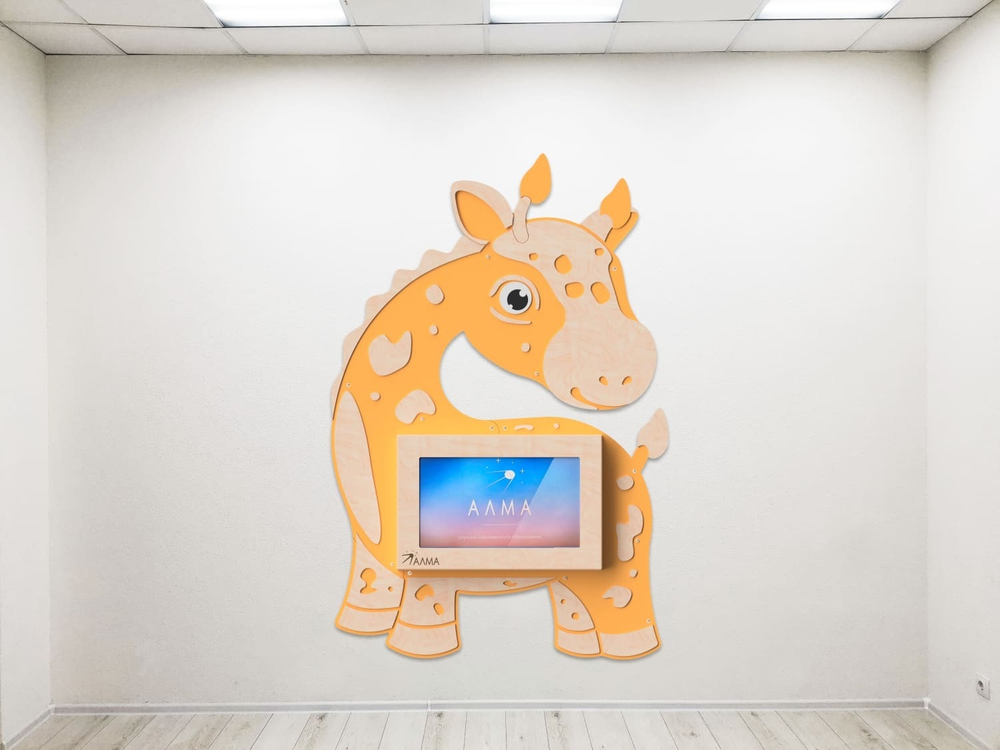 Настенная панель «Жираф» со встроенной интерактивной сенсорной панелью 32 дюйма. Это одновременно декоративное оформление стен и развивающая игрушка, ведь на панели установлен пакет игрового и обучающего ПО от АЛМА.