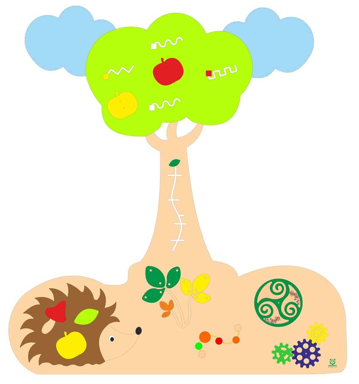 Объемные разноцветные элементы под деревом помогают малышам на ощупь познакомиться с новыми формами и линиями, понять контрастное сочетание цветов и запомнить названия предметов.