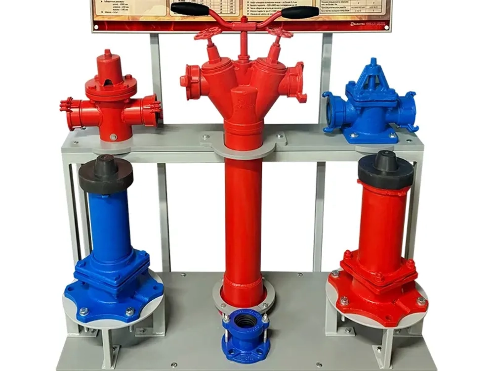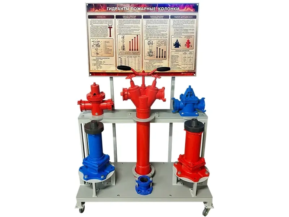 Учебное оборудование представляет собой основные применяемые виды пожарных гидрантов и колонок, установленные на металлическом основании, и предназначено для ознакомления с основами пожаротушения. Стенд оснащен информационным панно, установленным на металлическом кронштейне, на котором представлена информация о существующих видах пожарных гидрантов и колонок, их устройстве и технических характеристиках.