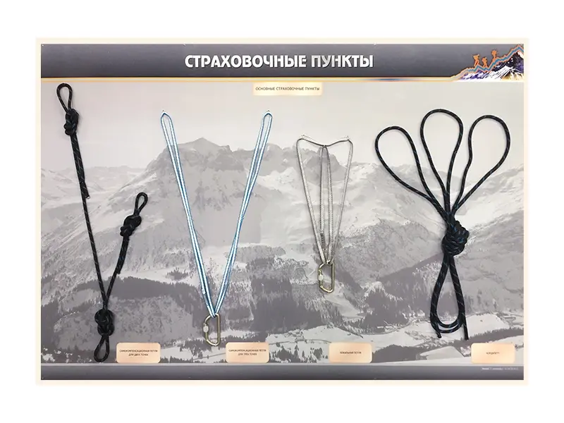 Демонстрационный стенд "Страховочные пункты" представляет собой настенную доску с рамкой, на которой представлены образцы основных страховочных пунктов: