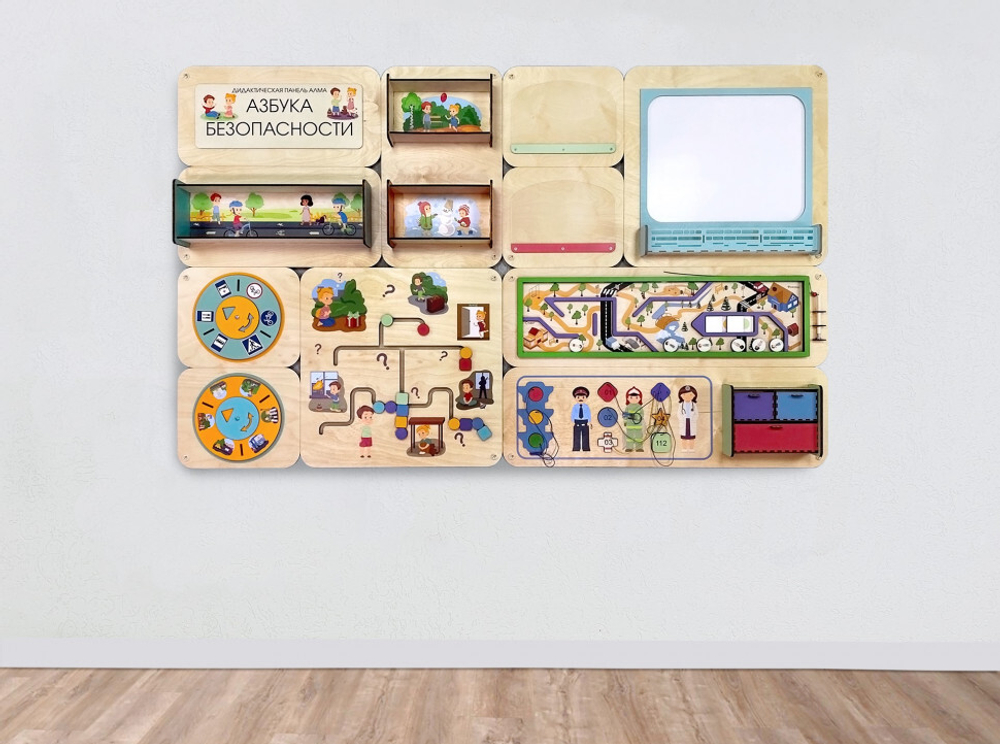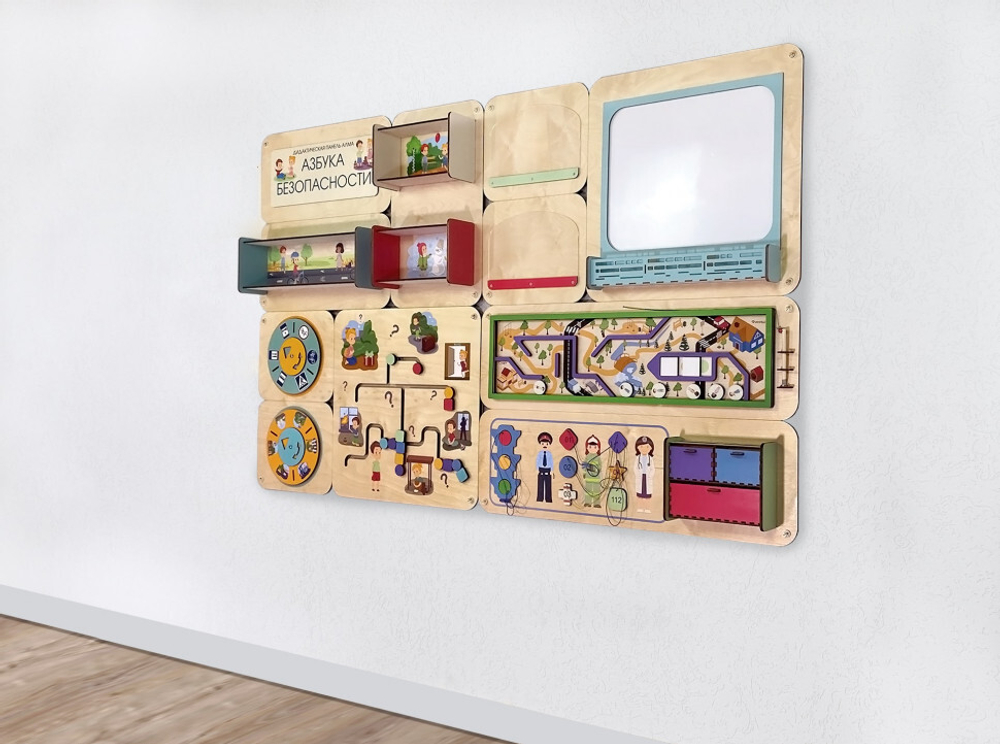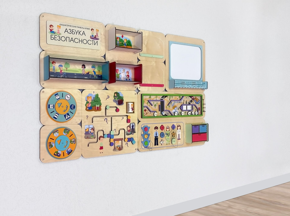 Образовательная панель для оформления пространства детских учреждений. Состоит из четырёх модулей, которые можно комбинировать по своему усмотрению.