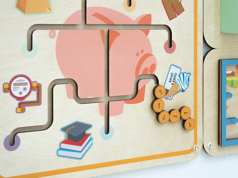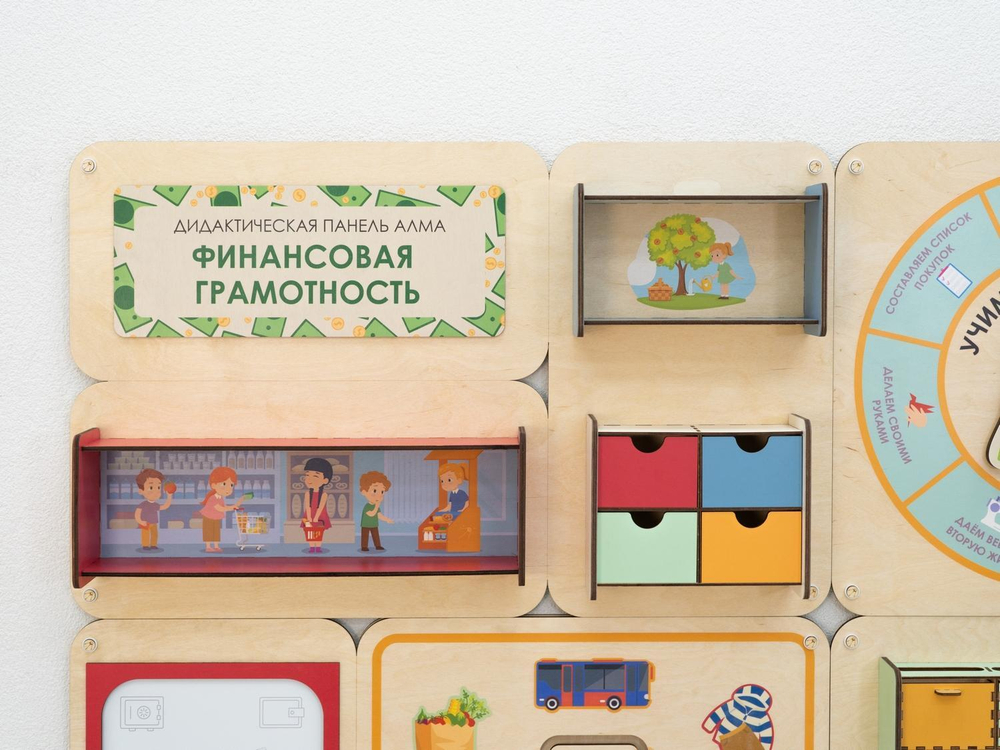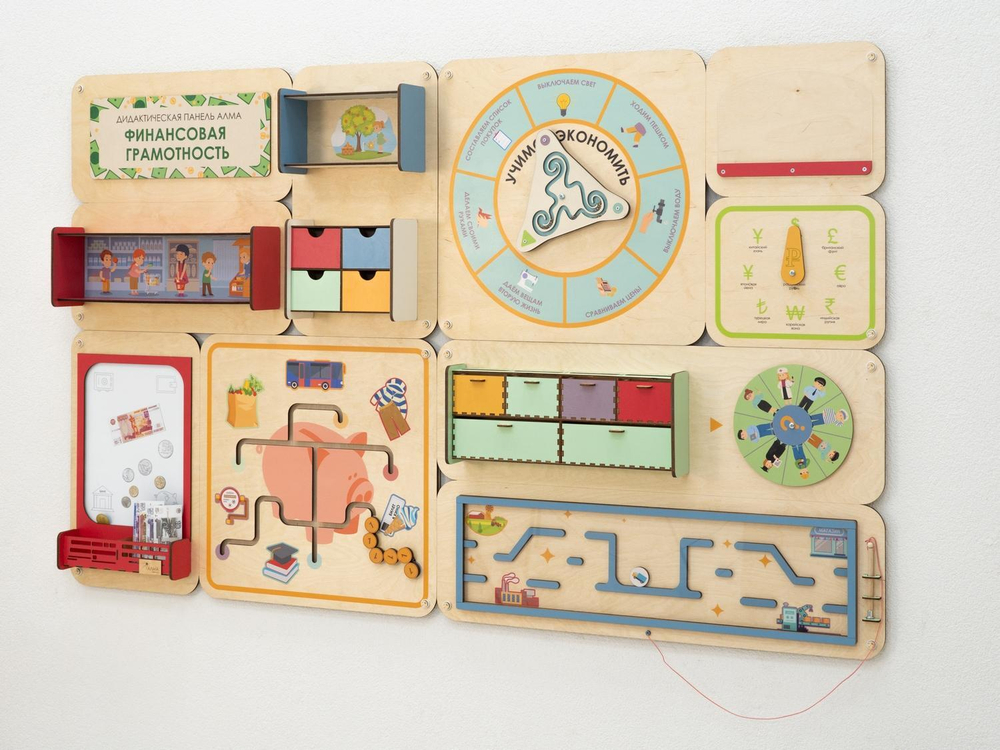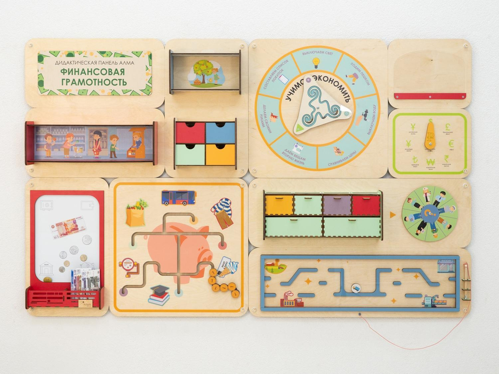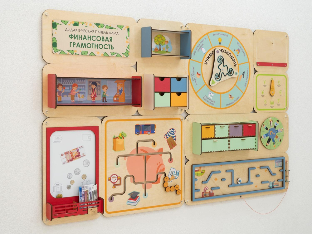 Образовательно-развивающая настенная панель "Финансовая грамотность" для обучения дошкольников в детских учебных учреждениях основам финансовой грамотности. Игровые элементы по системе Монтессори развивают мелкую моторику детей, а подробное методическое руководство помогает педагогам в проведении занятий. Подходит для оснащения детских садов и учреждений дополнительного детского образования.