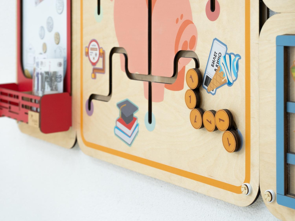 Панель увеличивает площадь полезного развивающего пространства в детском саду. Повесьте её на стену – и она не только станет незаменимым подспорьем в занятиях по финансовой грамотности, но и украсит помещение, скрывая дефекты стен.