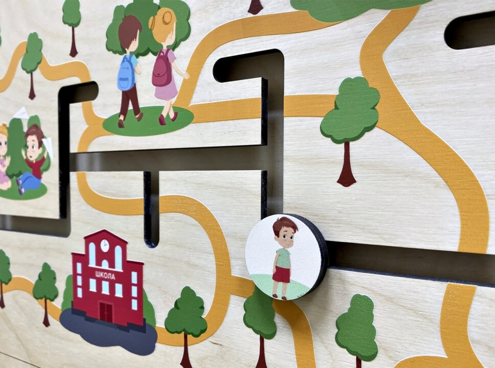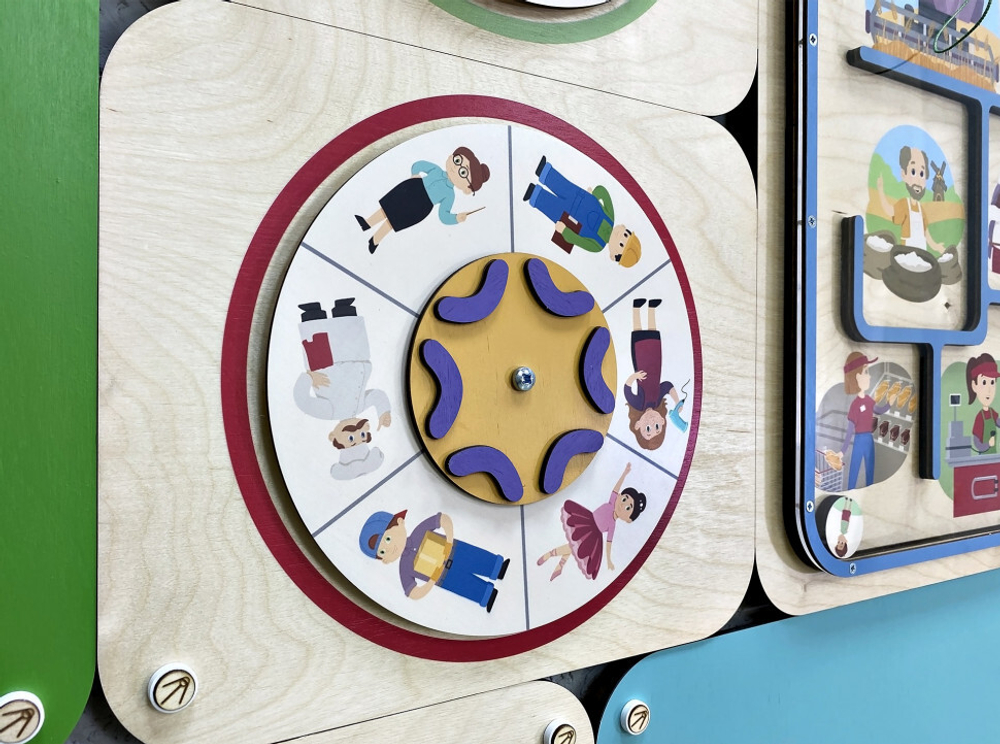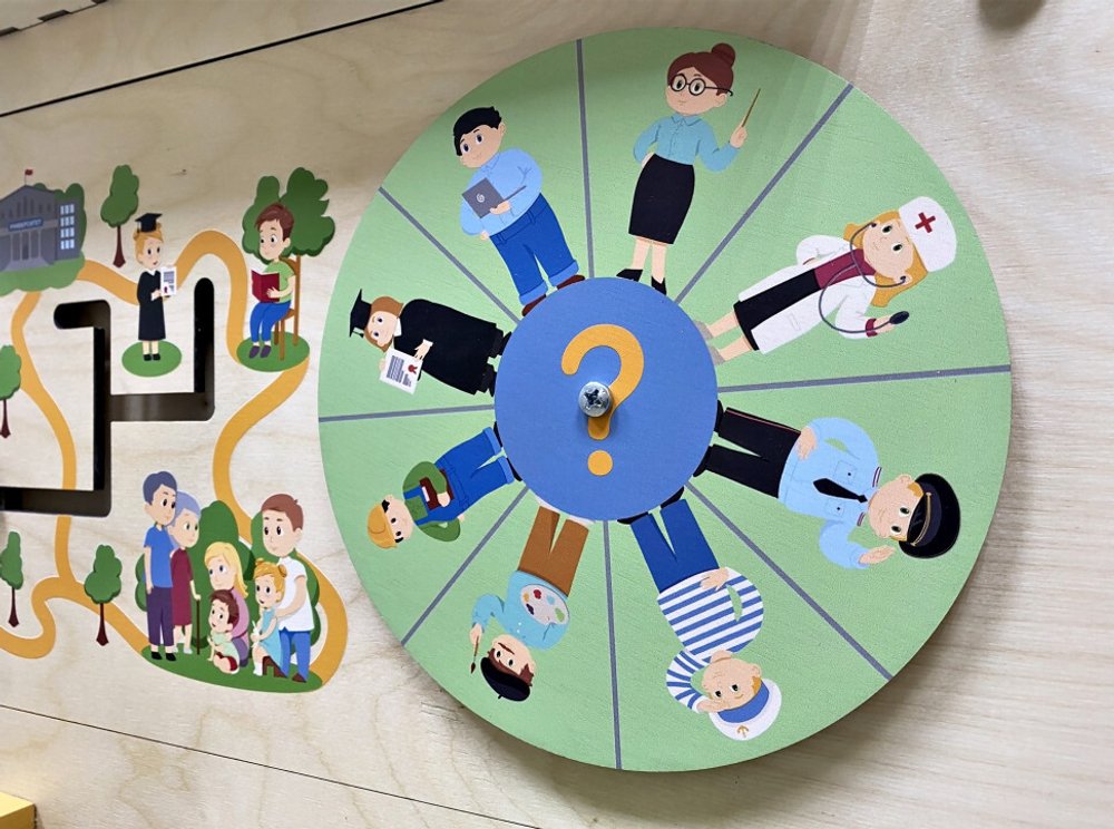 Развивающий лабиринт «Выбирай играя» знакомит детей с важными этапами жизненного пути человека. На крутящемся диске ребёнок может выбрать одну из восьми современных профессий.