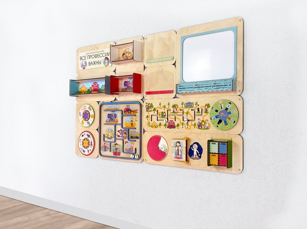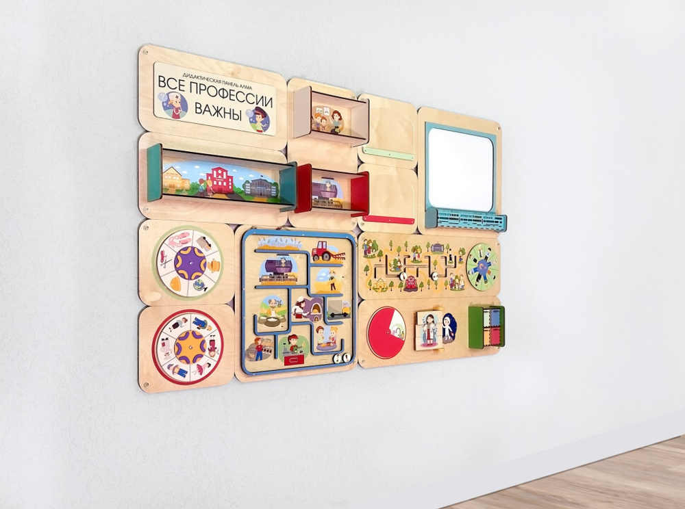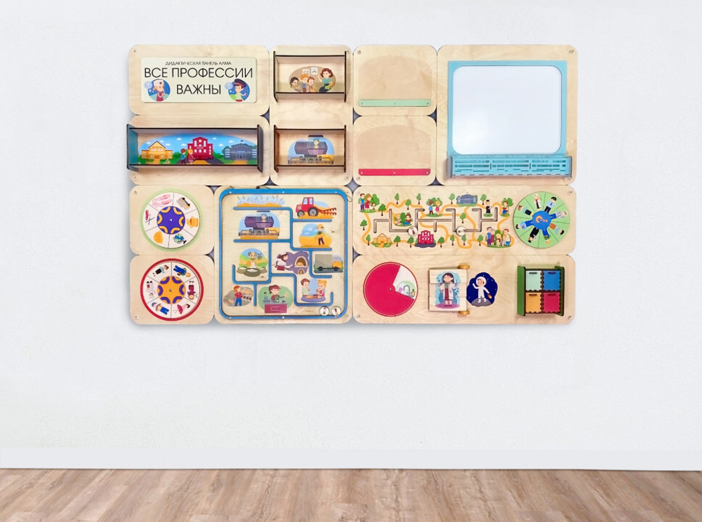 Образовательная панель АЛМА "Все профессии важны" для оформления пространства детских учреждений. Состоит из четырёх модулей, которые можно комбинировать по своему усмотрению.