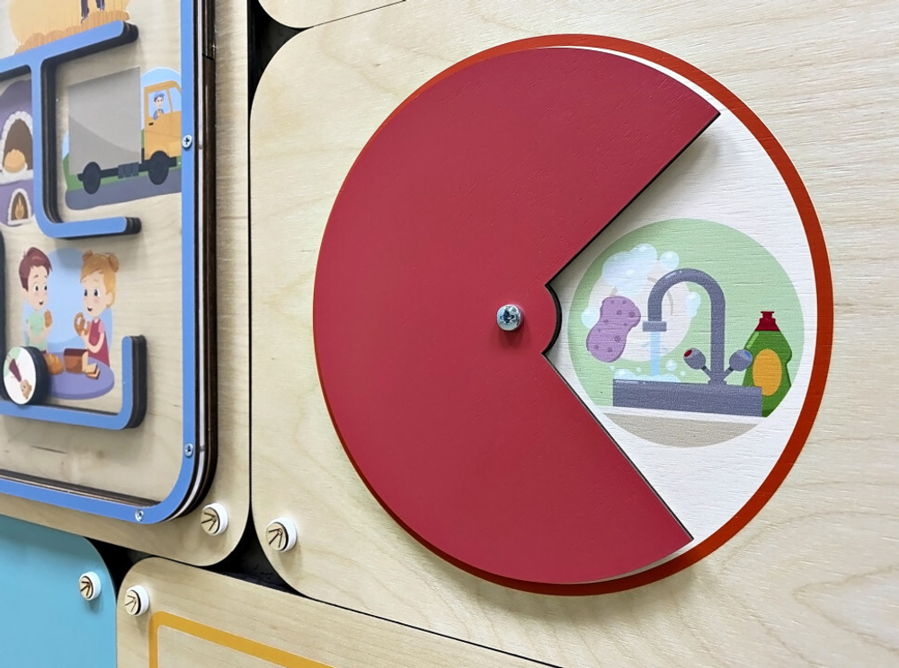 Крутящийся диск «Домашние дела». Дети узнают, чем они могут помогать родителям дома. Обучает бытовым навыкам и самостоятельности.