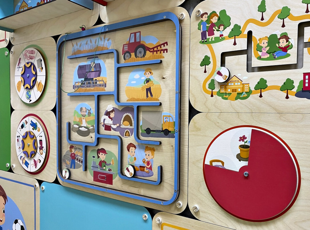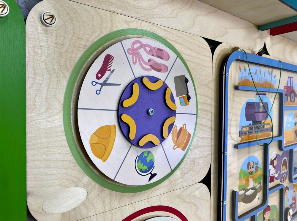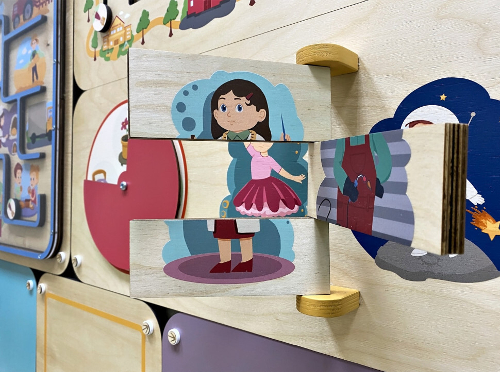 Вместе с педагогом ребята смогут пофантазировать на тему «Кем я буду, когда вырасту». Панель знакомит с разными профессиями и важными этапами жизни человека, развивает логику и мышление, тренирует мелкую моторику и цветовосприятие.