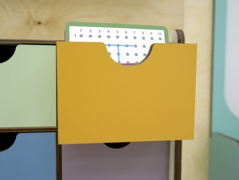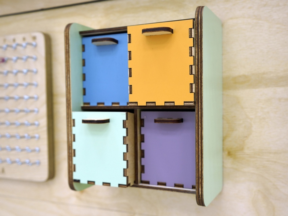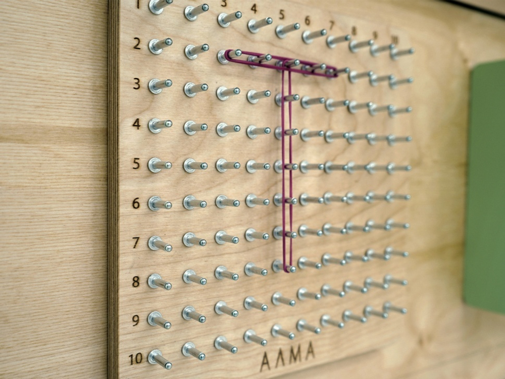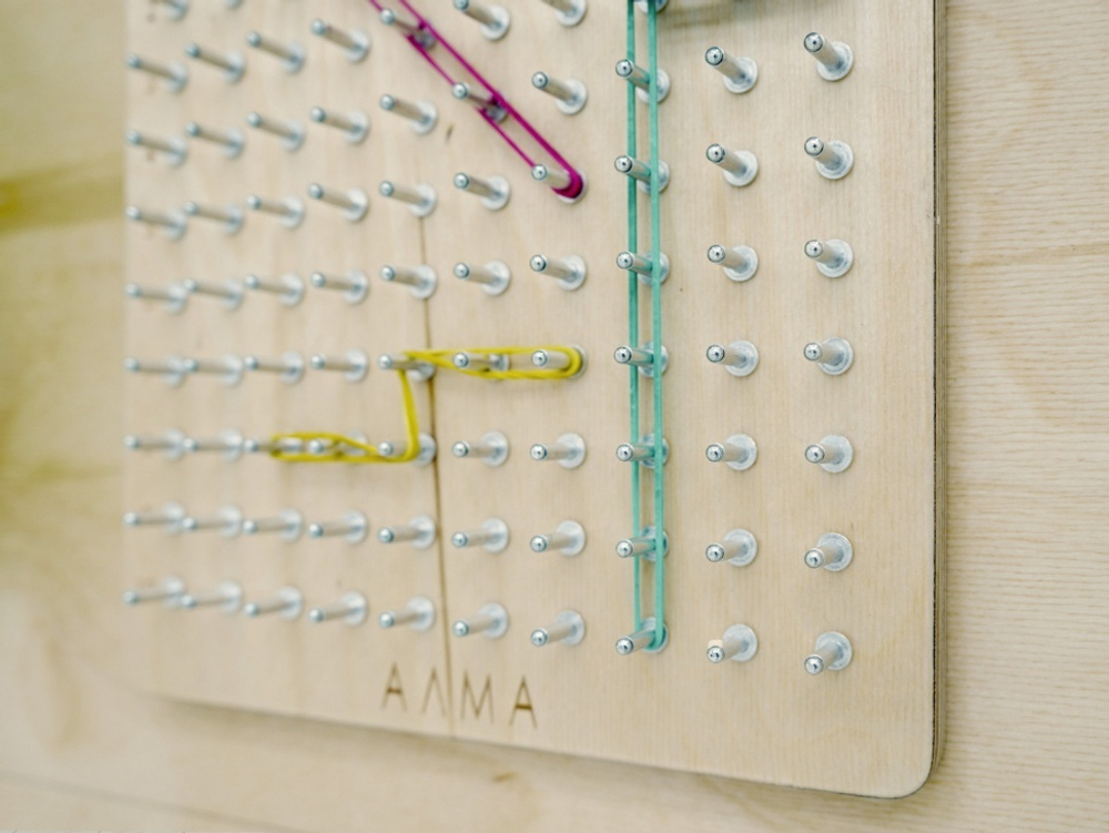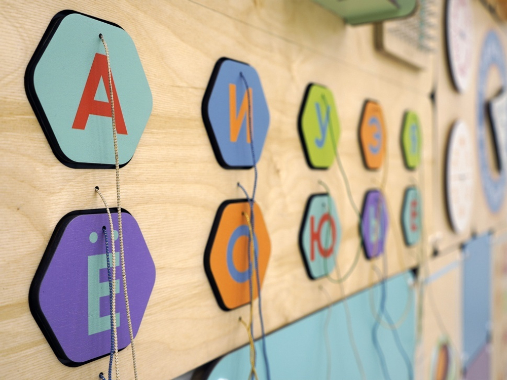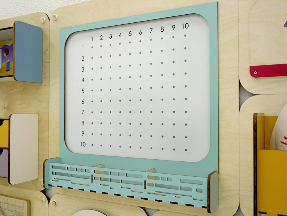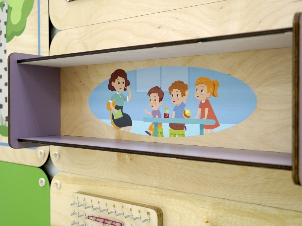 • Модуль «Геоборд». С помощью резинок малыши могут выкладывать буквы и символы, что педагог рисует на магнитно-маркерной доске, принт которой повторяет поверхность геоборда. Это развивает мелкую моторику рук, а стимуляция моторных навыков пальцев рук у детей активизирует речевой центр в головном мозге.