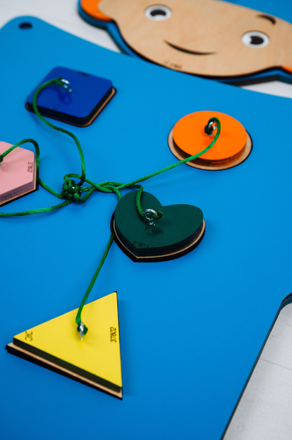 Элементы закреплены к основе при помощи веревочек, что позволяет им не растеряться, если дети будут играть небольшой группой;