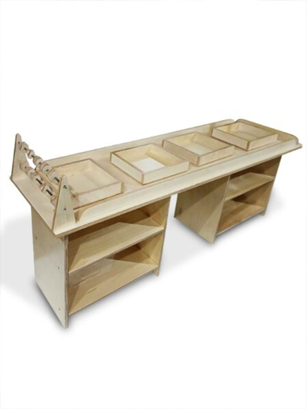На столешнице расположено 4 встроенных ящика для хранения разных предметов. Слева находятся счёты: на металлическом стержне нанизаны деревянные геометрические фигуры.