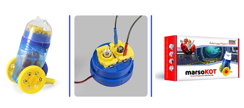 Набор представляет собой динамо-машину в форме игрушечного кота. Содержит съёмные насадки (конденсатор, светодиод, лампочку накаливания, зуммер). Демонстрирует преобразование энергии из механической в электрическую, из электрической в световую, звуковую и механическую. Может использоваться как игрушечная машинка с колёсами.
