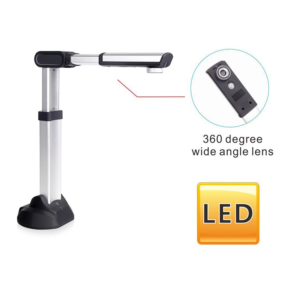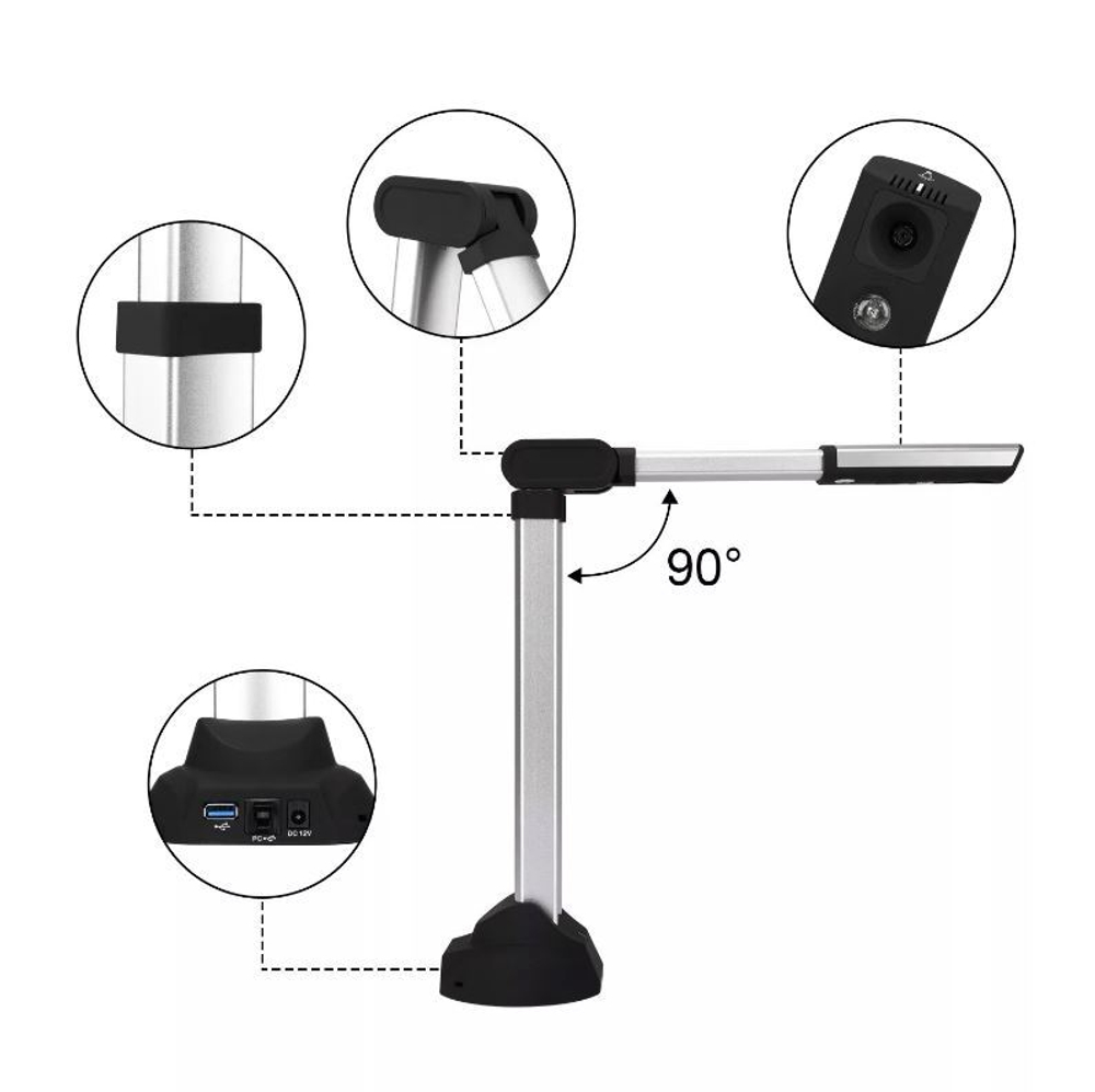 Документ-камера с разрешением 4416×3312, 15 Мп матрицей, рабочей областью захвата A3 и складным штативом.