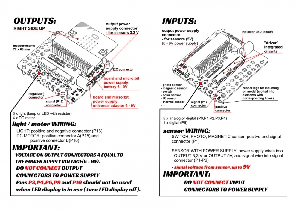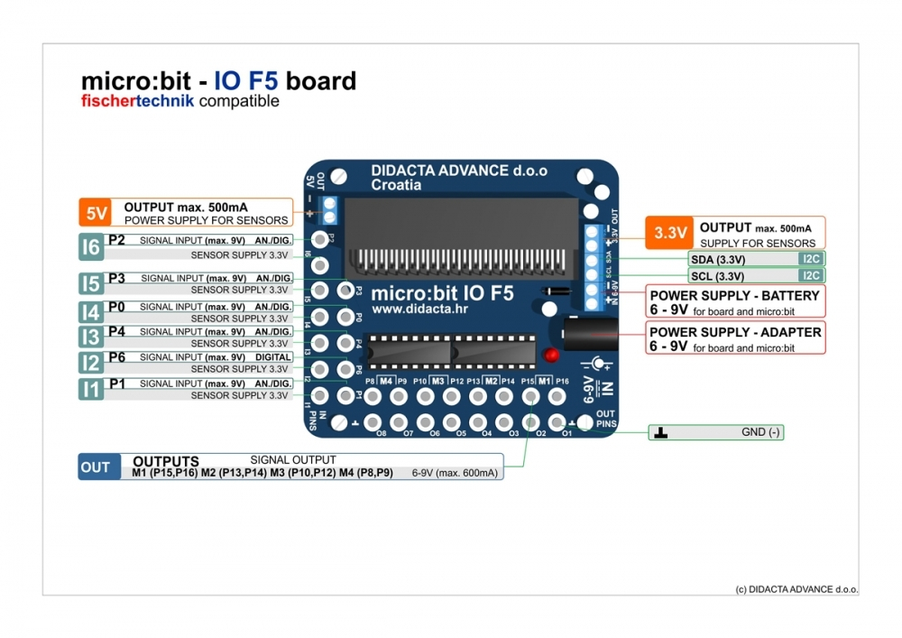 Адаптер для работы платы micro: bit F5 с наборами fischertechnik. Даёт возможность подключения стандартных датчиков, моторов, лампочек fischertechnik. Адаптер имеет резиновые ножки для установки на стандартное основание. Имеется выход 5В с максимальным током 500 мА и выход 3.3В с максимальным током 500 мА для питания датчиков. Адаптер также позволяет подключать датчики по шине I2C.