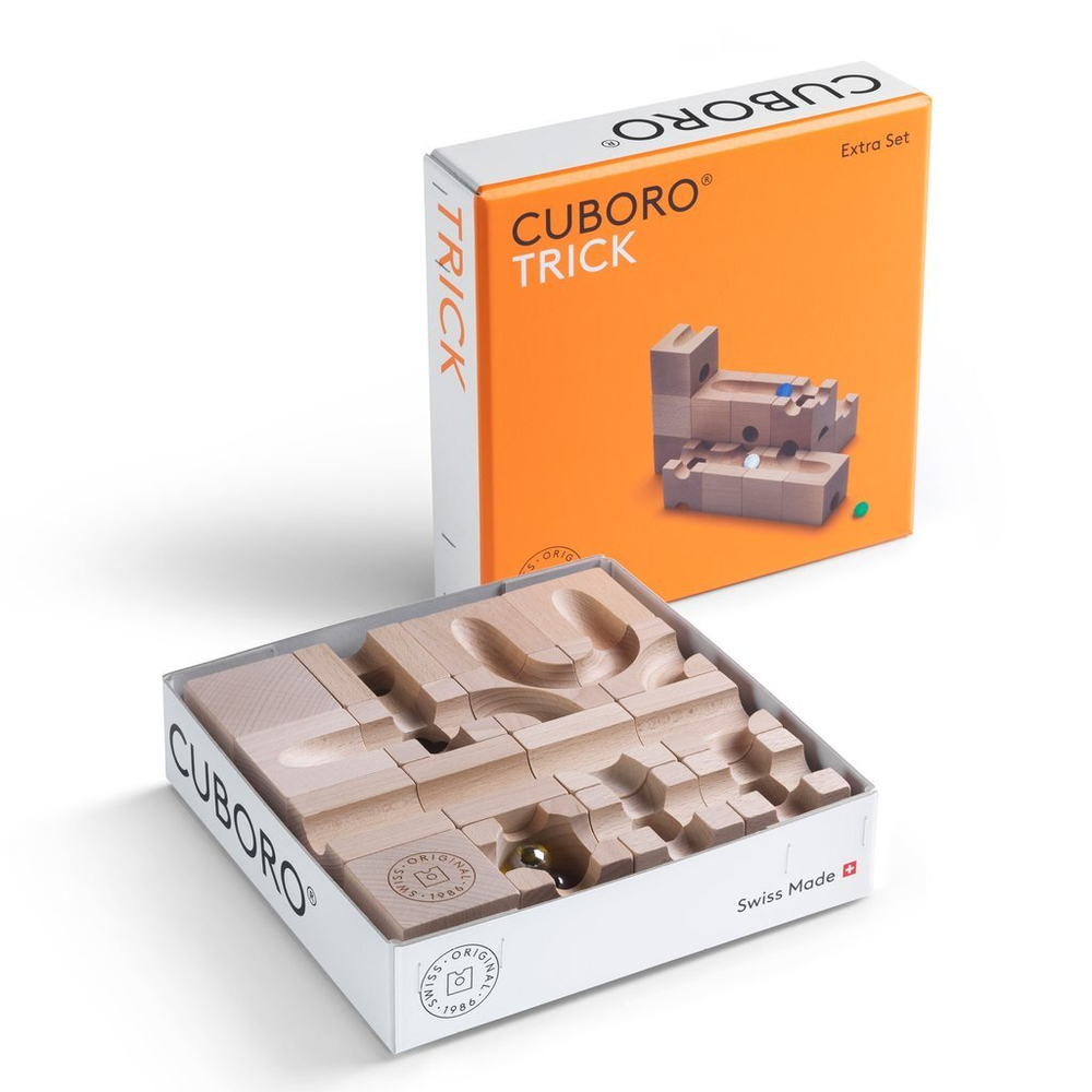 Конструктор Cuboro TRICK нельзя использовать самостоятельно. Набор используется для расширения возможностей стартовых наборов. Благодаря Cuboro TRICK вы можете построить конструкции, в которых шарик ускорится, откатится или пойдет туда не знаю куда.