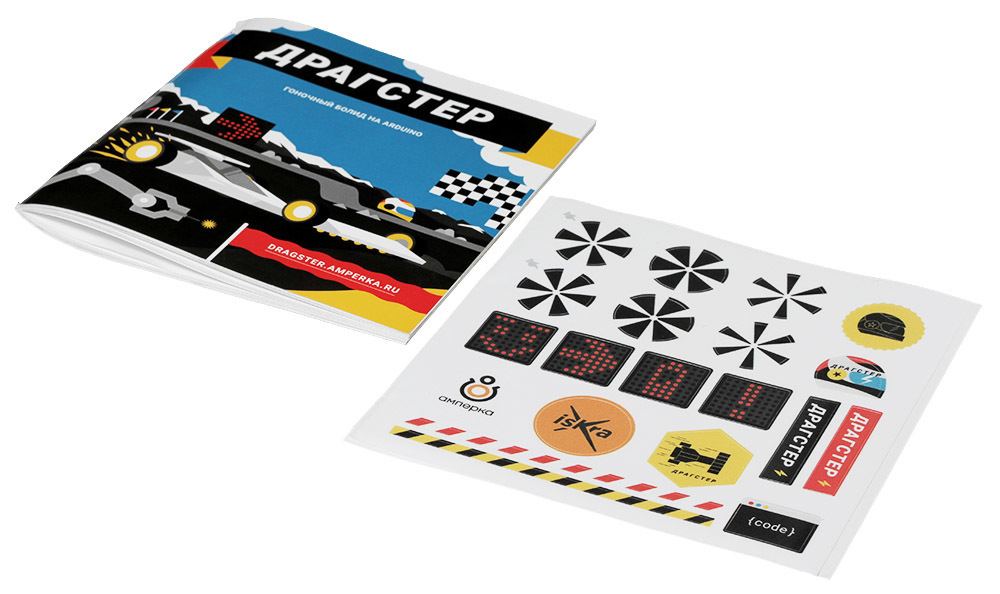 В коробке ждёт полностью собранный Драгстер – с контроллером Iskra Neo, восьмиканальным датчиком линии, двумя моторами, светодиодной матрицей и аккумулятором на борту.