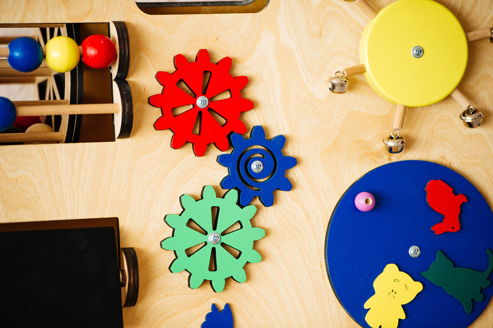 Двухсторонняя тактильная панель «Новые умения» - состоит из двух фанерных панелей соединенных друг с другом под углом. На поверхности расположены различные барабаны с шариками, шестеренки, тарахтушки и прочие завлекающие элементы. При помощи разнообразного оборудования ребенок узнает принцип работы механизмов.