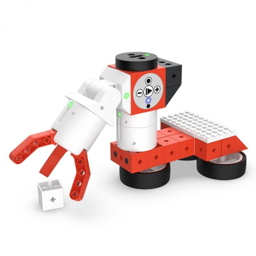 Моторы, датчики света и расстояния выполнены в том же форм-факторе и размерности, что и кубик контроллера, только белого цвета. В состав наборов включены модули - шарниры, цилиндры вращения и цилиндры с трёхпальцевым манипулятором, соединительные кубики, пластиковые детали разного цвета для сборки неподвижных узлов, оси, колёса и кубики с адаптером для присоединения стандартных элементов конструктора LEGO. Сборка элементов проста – достаточно присоединить два модуля контактными площадками друг к другу и повернуть один из них против часовой стрелки. Поворот в обратную сторону разъединит кубики. Не нужно никаких проводов для соединения различных блоков с электроникой или без неё. Соединить два блока неправильно не получится.