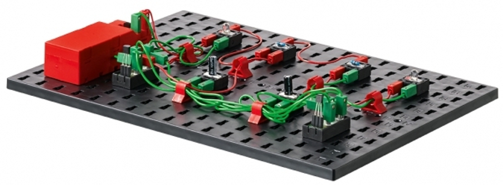 Конструкторский набор для увлекательных экспериментов с электронными и автоматическими устройствами. С помощью этого конструктора юные инженеры смогут познакомиться с основами электроники и изучить: простые электрические цепи, параллельное и последовательное соединение элементов, схемы с транзисторами, конденсаторами, резисторами и светодиодами. Электронный модуль управления E-Tec содержит 24 программы, готовые к работе, и оборудован входами и выходами для подключения двух моторов и трех датчиков. С его помощью можно управлять различными действующими устройствами, среди которых автоматический вентилятор, маяк, семафор, автоматический шлагбаум и другие. Набор включает мини-учебник и состоит из 260 деталей, из которых можно собрать 16 увлекательных электронных устройств.