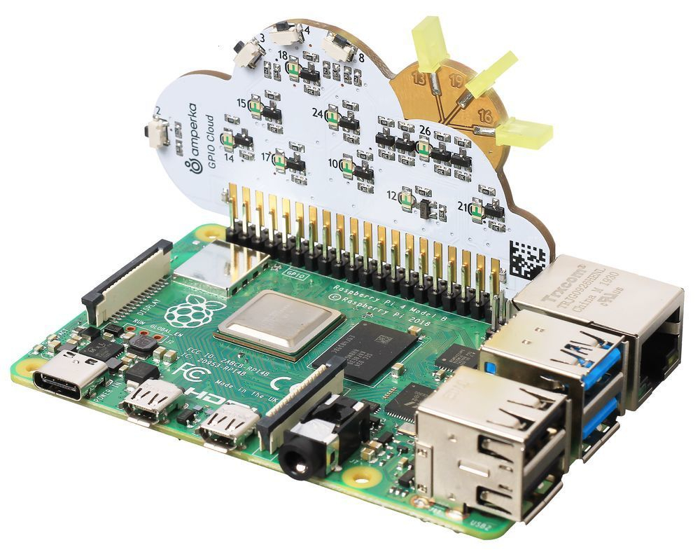 Чтобы не возиться с макетными платами и россыпью радиодеталей, мы придумали электронное облачко. На нём четыре кнопки и дюжина жёлтых и синих светодиодов. Облачко садится на штатные пины GPIO, и его элементами можно управлять напрямую из программного кода.