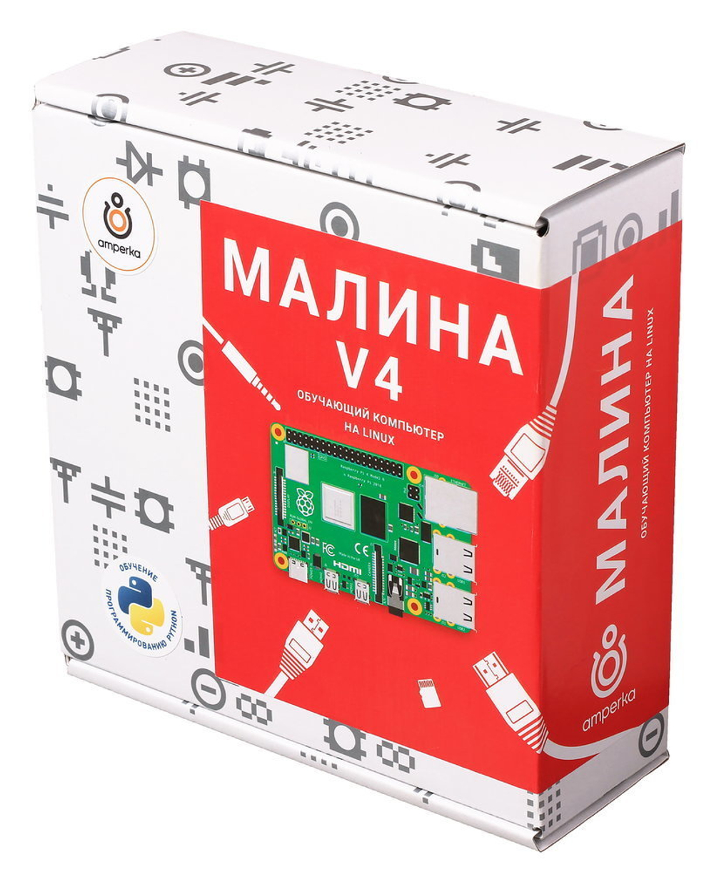 Сердце набора – Raspberry Pi 4 Model B (1 ГБ). Это компьютер размером с банковскую карту. На борту вы найдёте привычные компоненты: процессор, оперативную память, два порта Micro-HDMI, четыре USB, Ethernet, модули Wi-Fi и Bluetooth.