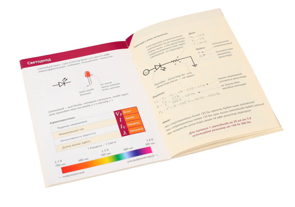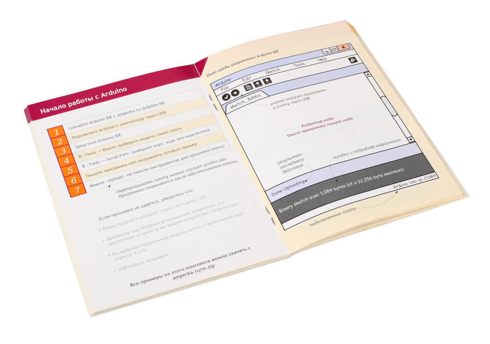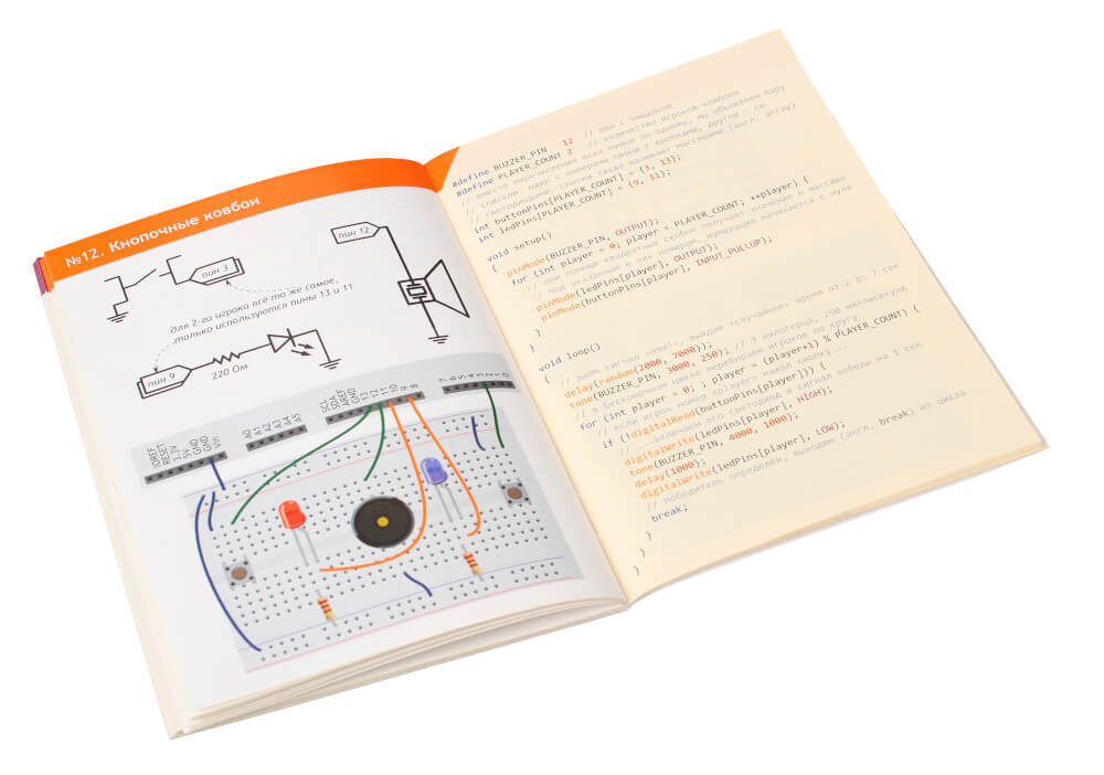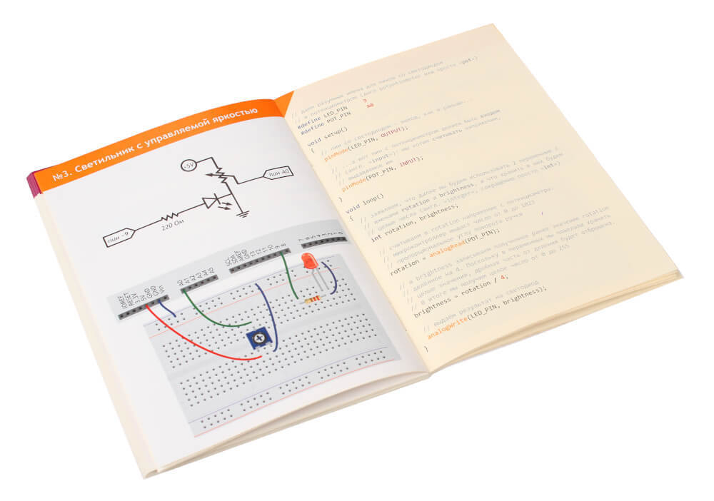 В красочном буклете приведены 20 устройств. Каждый учебный проект сопровождается цветной схемой сборки и готовым кодом программы (скетчем) с подробными комментариями.