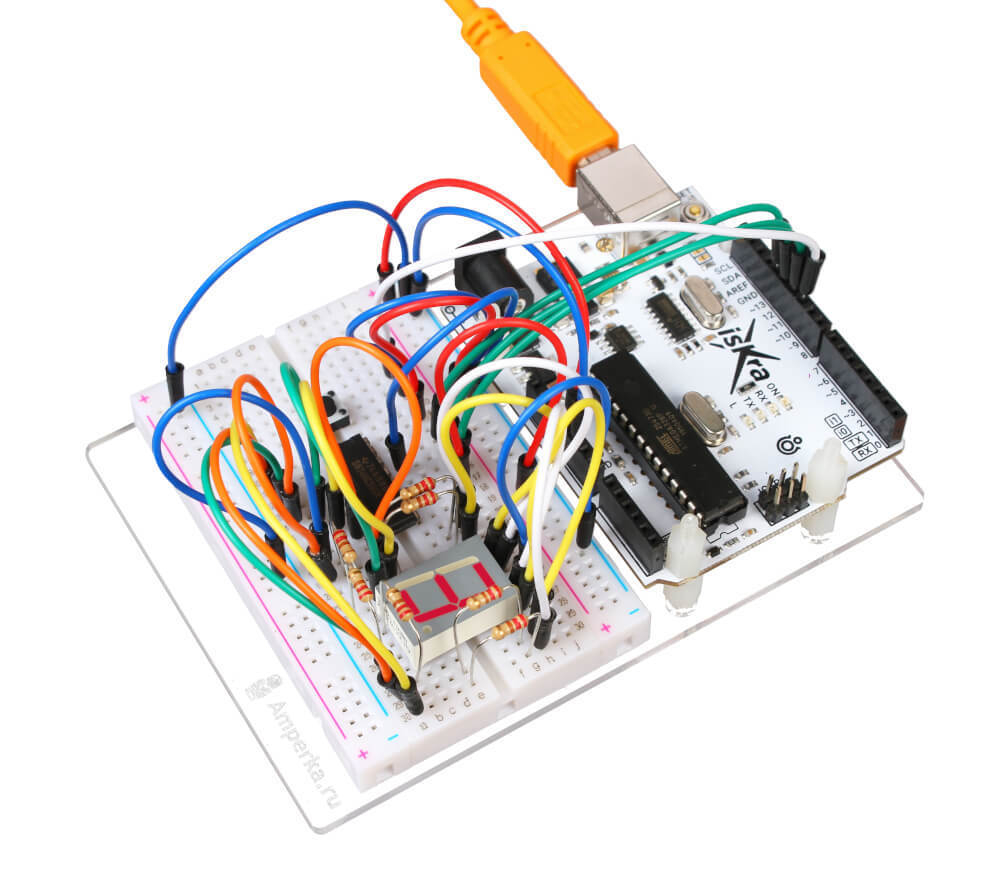 Мозг набора – Iskra Uno, миниатюрный компьютер, который программируется на C++. Простые программы – скетчи – управляют устройствами, собранными из радиодеталей.