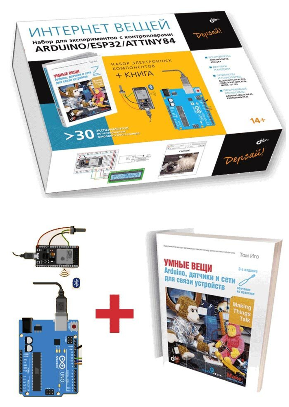 В набор входит книга Тома Иго “Умные вещи: Arduino, датчики и сети для связи устройств: Пер. с англ. 3-е изд.“, в которой рассмотрено создание проектов на основе различных микроконтроллеров (Arduino, RapberryPi, ATTiny84 и др.). Показано, как сделать, чтобы электронные устройства могли обмениваться между собой данными и реагировать на команды. Описана работа с четырьмя программными платформами и библиотеками с открытым исходным кодом: Arduino IDE 1.8, Processing, node.js и p5.js.