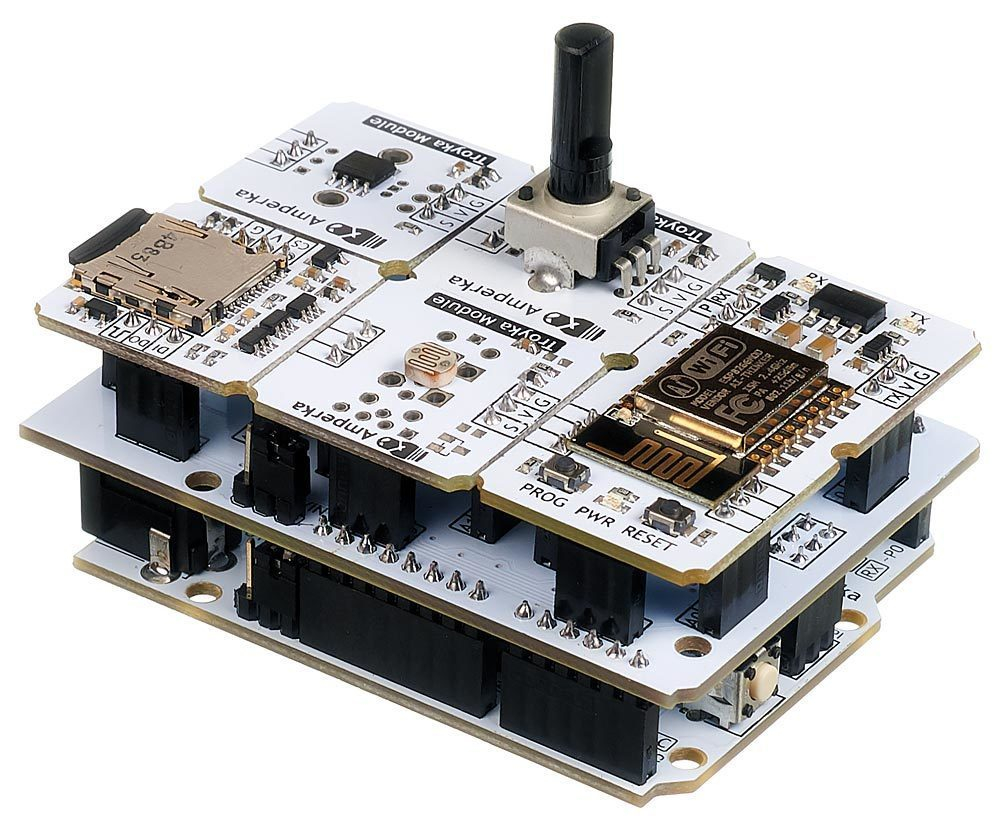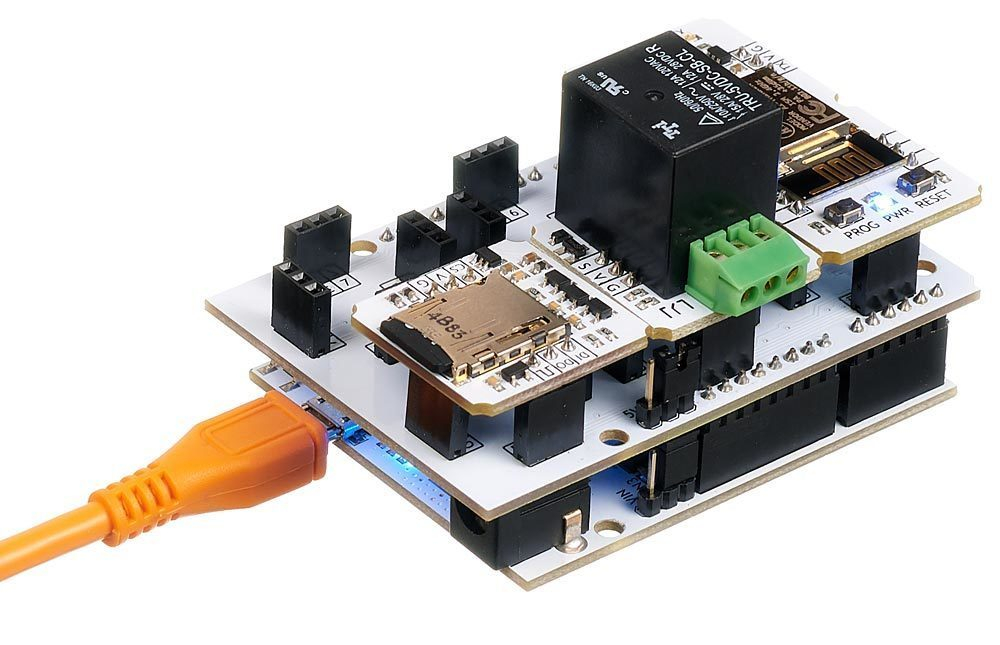 Сборка устройств не требует пайки и дополнительных инструментов. Модули вставляются в плату расширений Slot Shield. Устройства избавляются от лишних проводов и имеют законченный вид.