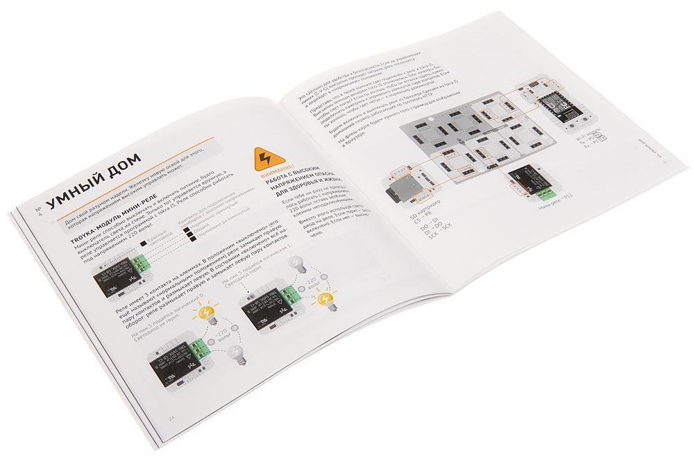 В набор входят 5 электронных компонентов и толстый цветной буклет с подробным описанием экспериментов, теоретической информацией и справочником используемых функций.