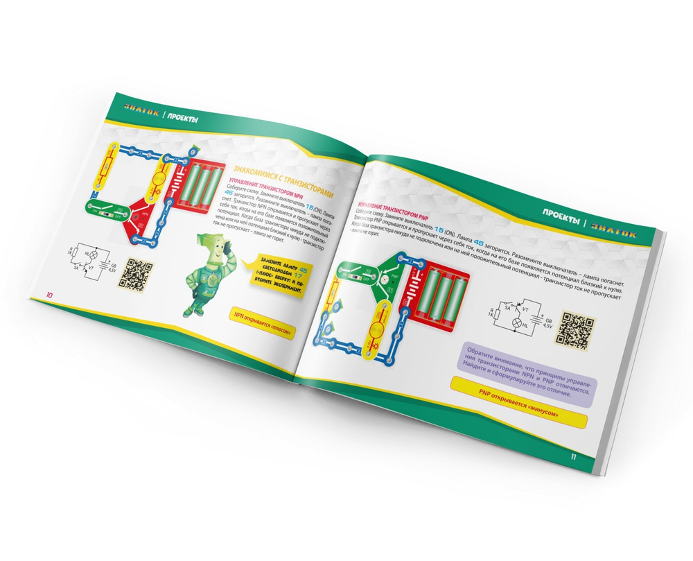 В комплектацию данного набора входит «Руководство пользователя» и детали, необходимые для выполнения предложенных в руководстве проектов. Руководство с описанием схем располагается в коробке под прозрачной монтажной платой. Нижняя часть коробки вместе с деталями и книгой запечатана в полиэтиленовую плёнку.