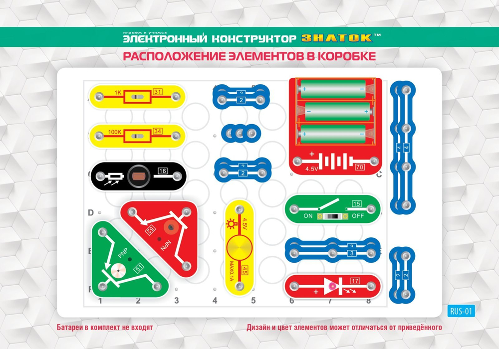 Помимо этого в «Руководстве пользователя» вы найдёте перечень элементов конструктора. Для удобства собирания деталей в коробку мы приводим схему расположения элементов.