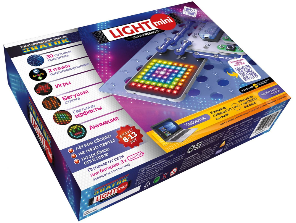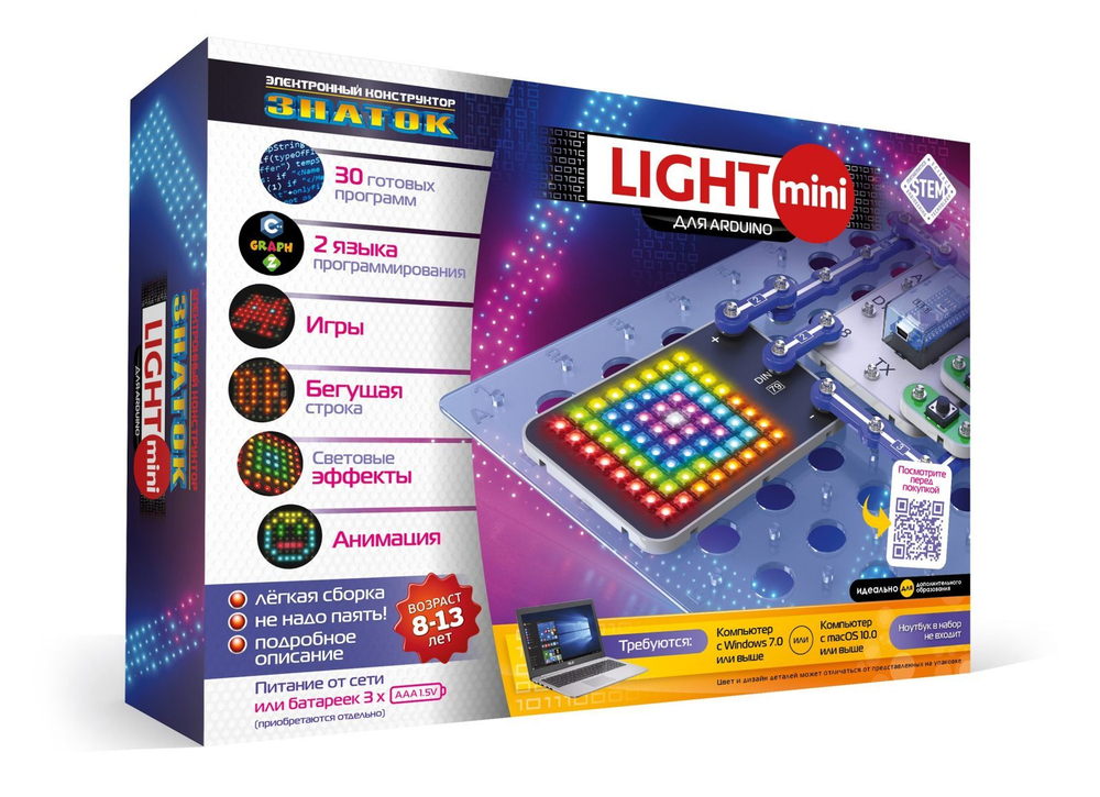 Детский электронный конструктор ЗНАТОК для Arduino LIGHT mini - это уникальная возможность ребенку самостоятельно создавать текстовые сообщения бегущей строкой, тетрис, анимацию, головоломку или даже стрелялку на светодиодном табло!