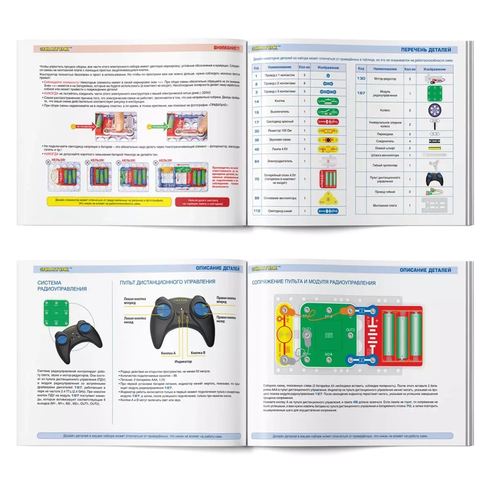 Яркое и понятное руководство поможет ребёнку собрать и испытать схему! Пульт дистанционного управления рассчитан на 99 каналов, что позволяет проводить соревнования с большим количеством участников.