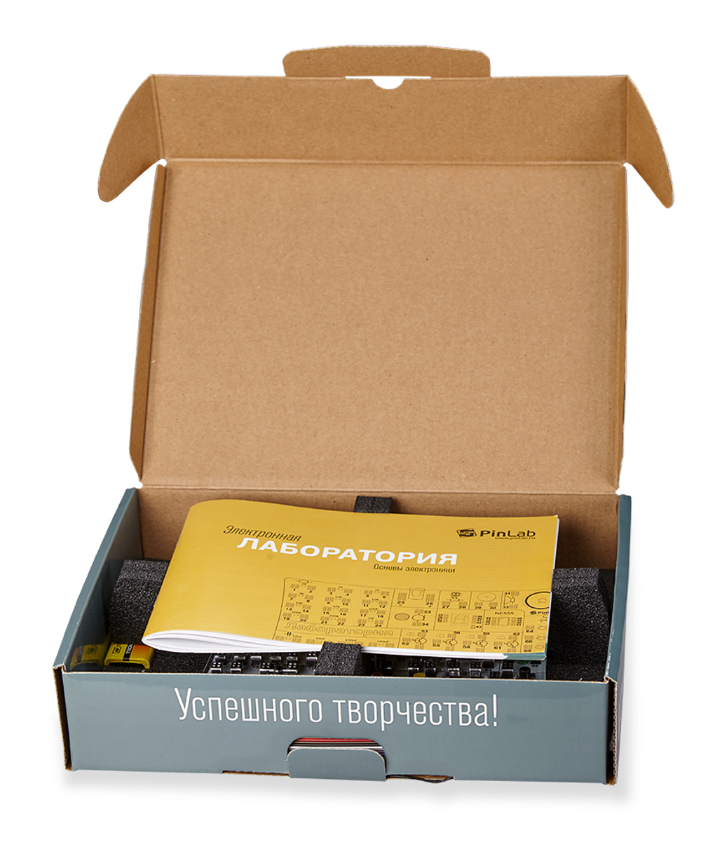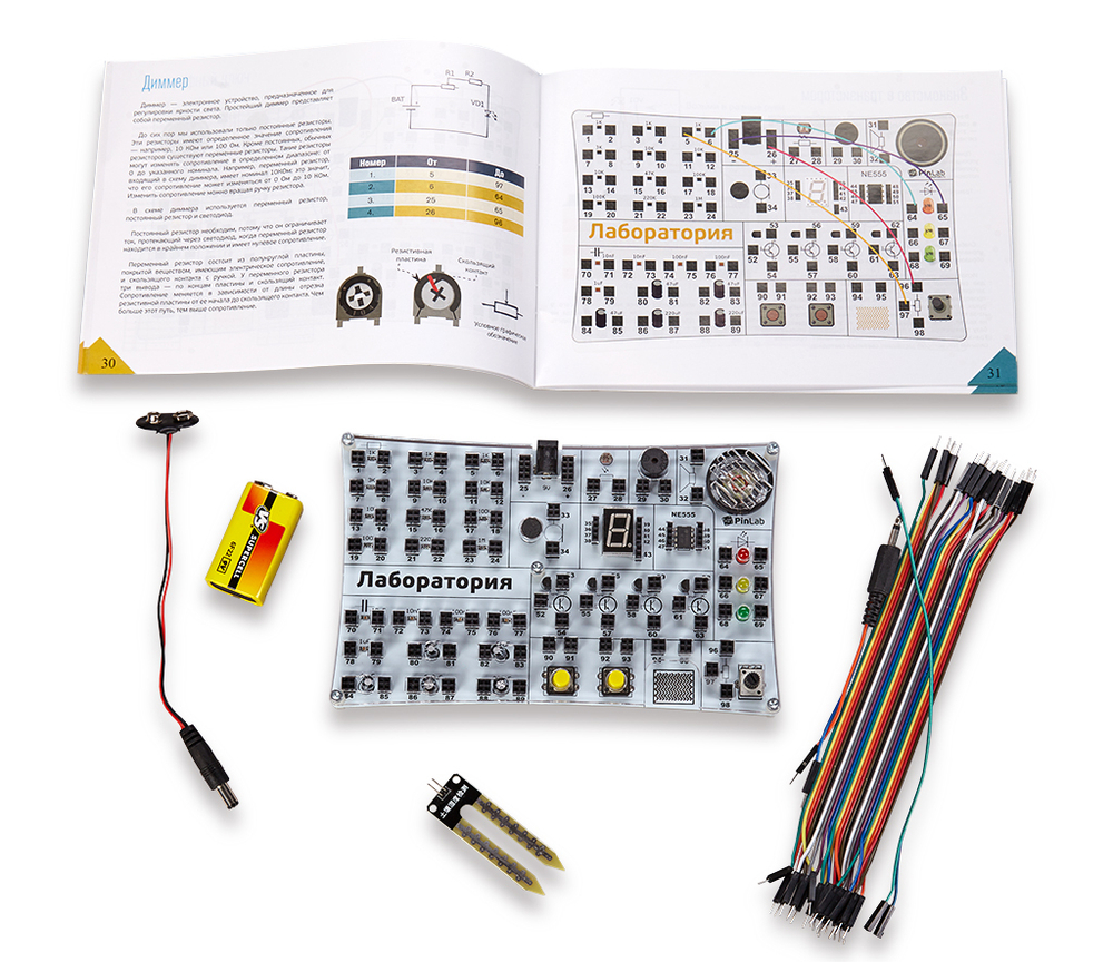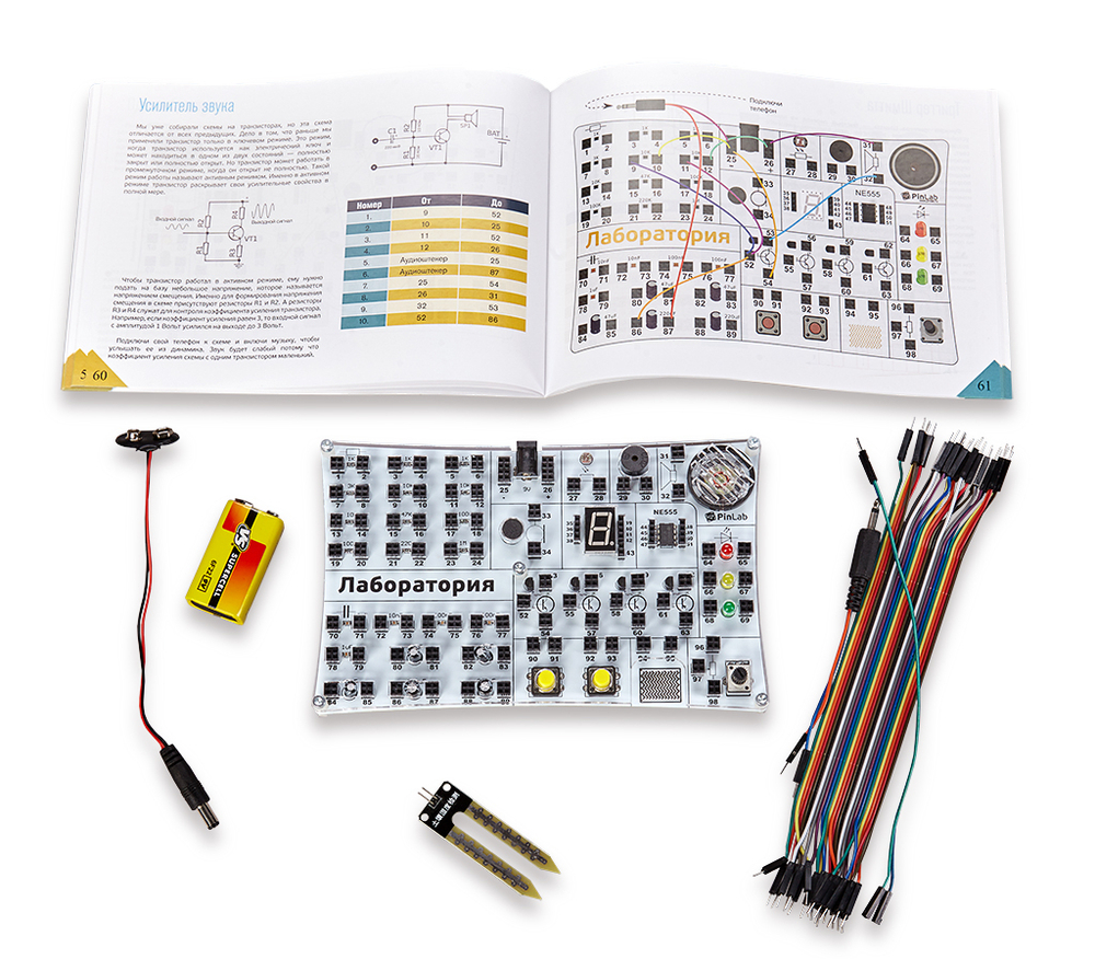 Набор «Лаборатория. Основы электроники» не требует пайки.Все конструкции собираются путем соединения разъемов проводами без пайки. Для питания всех устройств используется батарейка Крона напряжением 9 вольт, поэтому набор абсолютно безопасен. В ходе работы с набором детали не теряются и на столе не создается беспорядок.