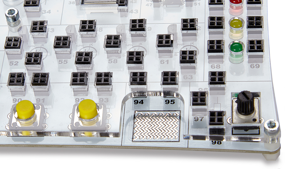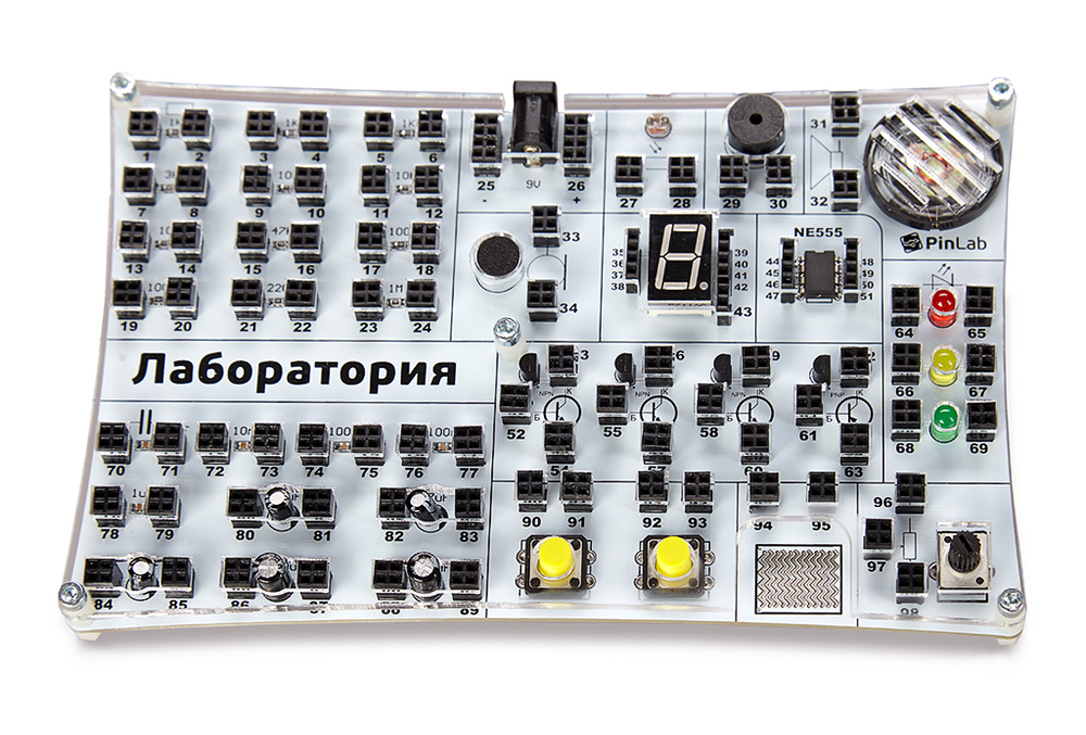 Основа всех конструкций. На плате установлены все электронные компоненты. К выводам электронных компонентов подключены разъемы. Разъемы соединяются между собой с помощью проводов из комплекта набора. Каждый разъем пронумерован. Провода можно вставлять и вынимать сколько угодно раз.