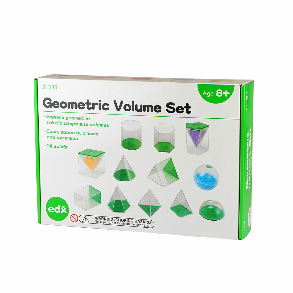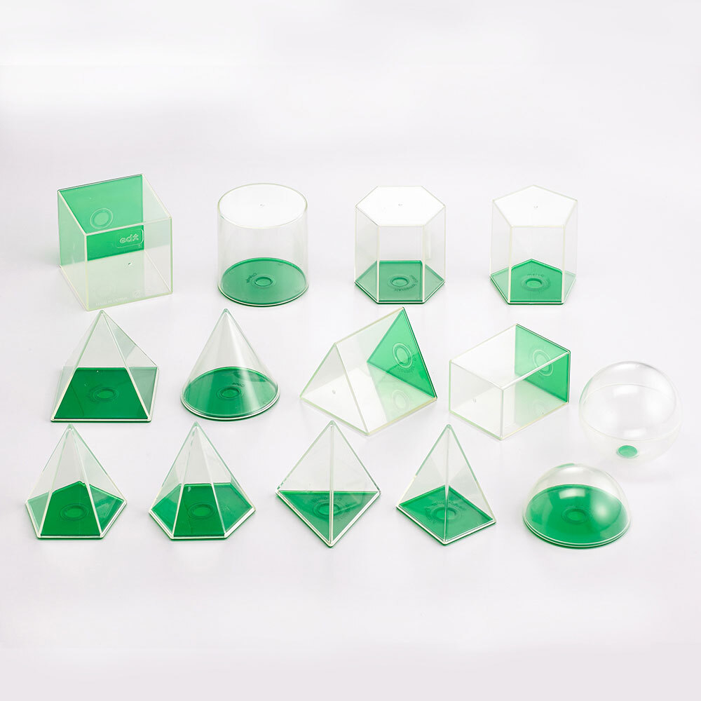Набор из 14 тел со съёмными крышками: куб, цилиндр, конус, треугольная призма, прямоугольная призма, пятиугольная призма, шестиугольная призма, квадратная пирамида, треугольная пирамида, четырехугольная пирамида, пятиугольная пирамида, шестиугольная пирамида, шар, полусфера.
