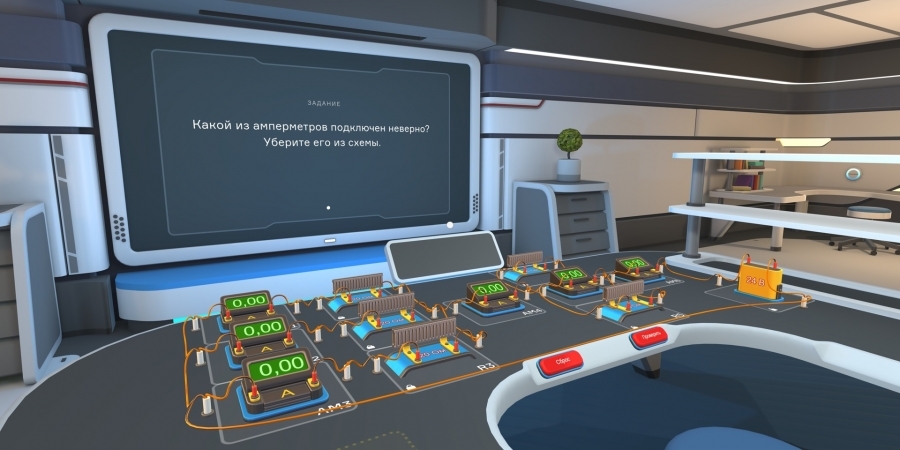 Практика С помощью пульта управления VR-устройства ученики решают практические задания на дополнение или корректировку электрических цепей с возможностью получить подсказку