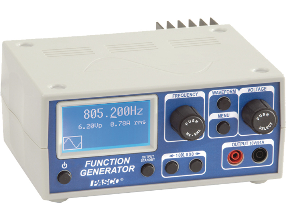 Функциональный генератор PASCO выдает формы сигналов, которые включают DC (постоянный ток), а также синусоидальное, квадратное, треугольное положительное и отрицательное пилообразное изменение сигнала в диапазоне частот от 0,001 Гц до 150 кГц. Выходная мощность 10 Вт (до 10 вольт и до 1 А) делает прибор пригодным для приведения в действие динамиков, струнных вибраторов и разных схем.