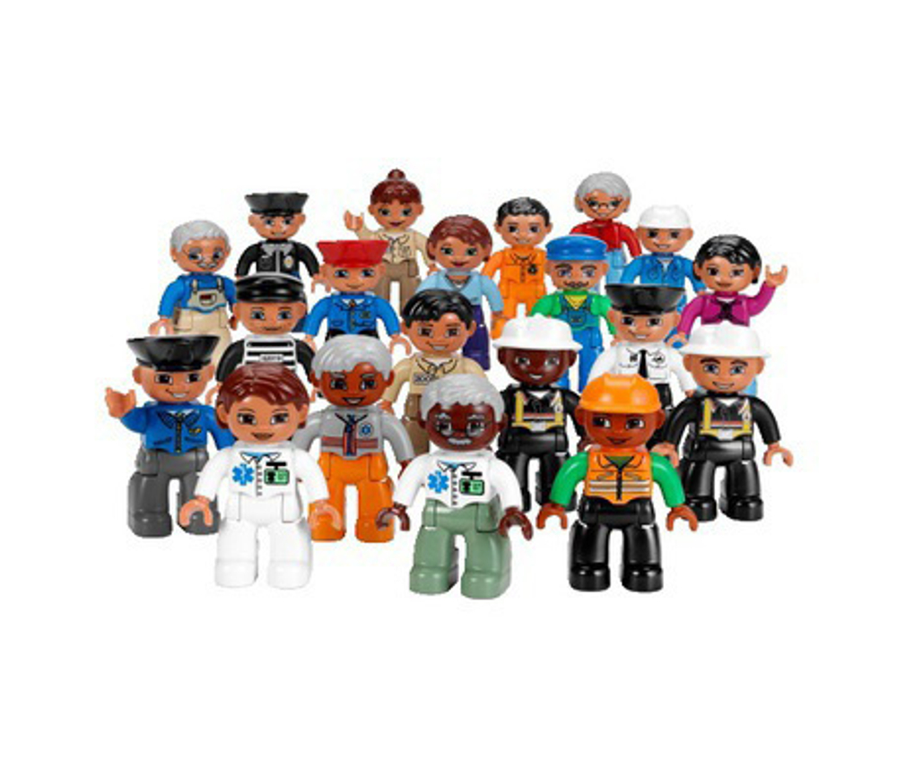 В этом наборе серии Lego Duplo представлены люди разных полов, возрастов и национальностей. Каждый из них одет в одежду соответствующую определенной профессии.