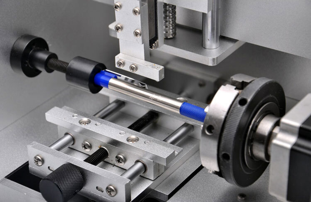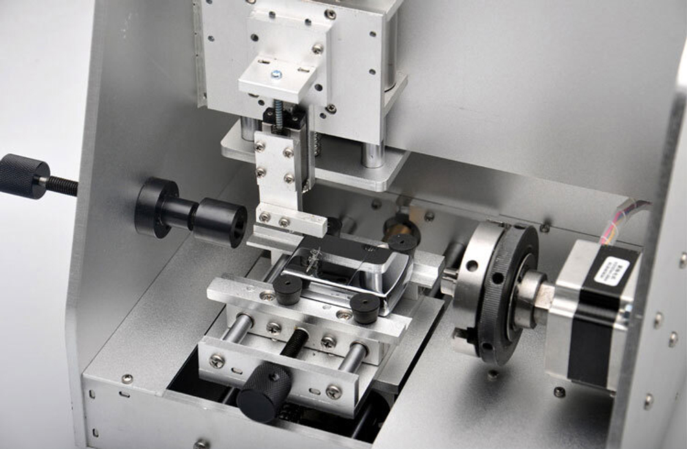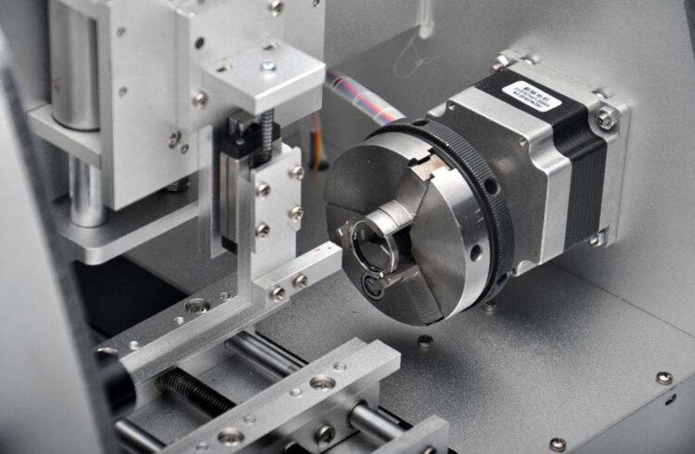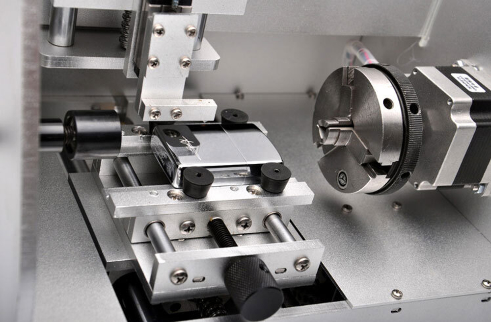 Станок оснащен поворотным устройством, что позволяет выполнять гравировку не только предметов на плоскости, но и гравировать ручки и кольца. Особенности контрукции позволяют выполнять гравировку колец как с внешней, так и с внутренней стороны.