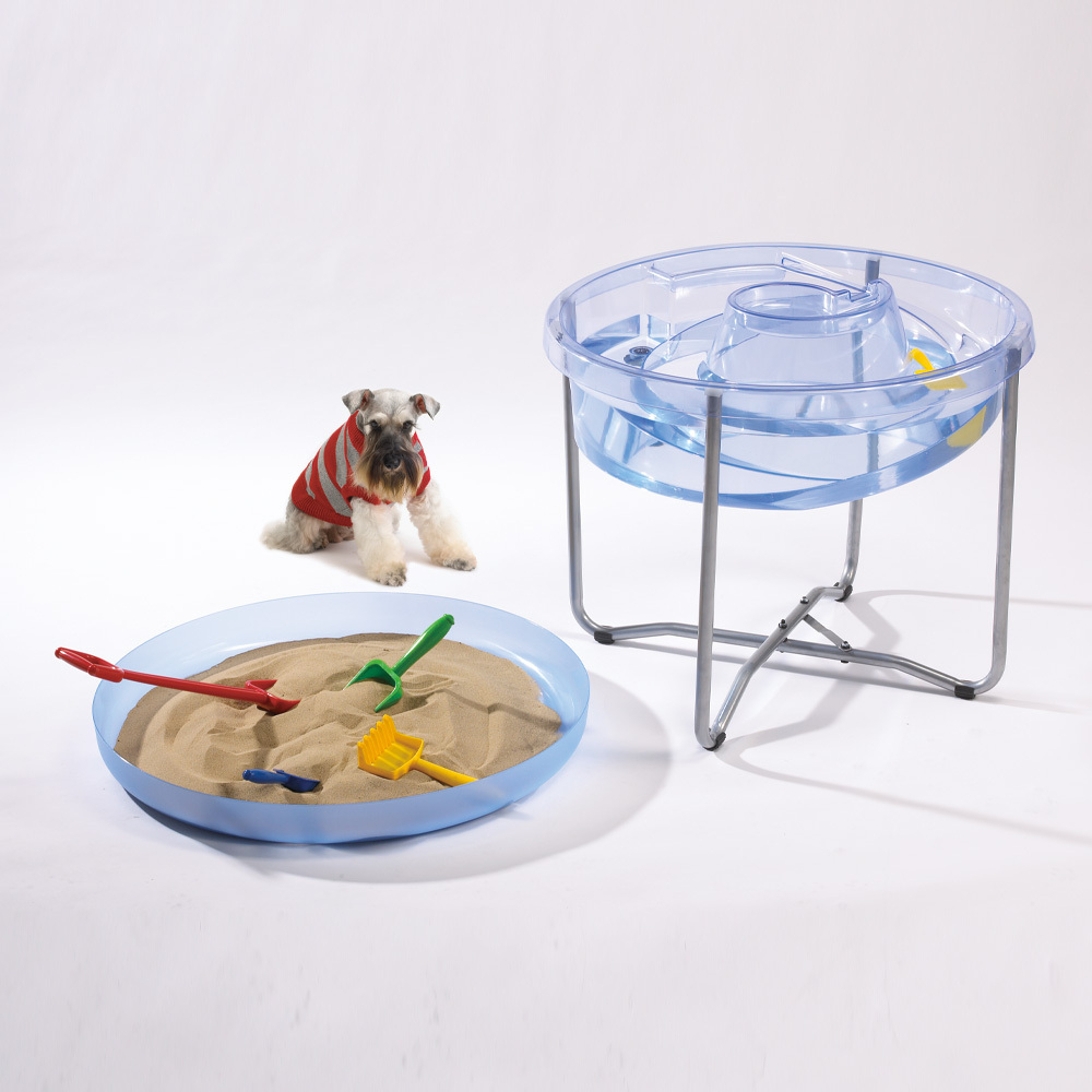 Центр воды и песка состоит из прозрачного круглого поддона со сливным отверстием и металлической подставки. Дно поддона разного уровня, выполнено в спиралеобразной форме, имеет наклон для стока воды и перемещения игрушек. В комплект входит крышка, которую можно использовать в качестве стола.