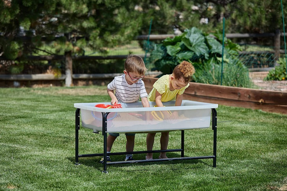 Центр воды и песка состоящий из большого полупрозрачного поддона со сливным отверстием и металлической подставки с 2-мя колесиками со стопорами для легкого перемещения.