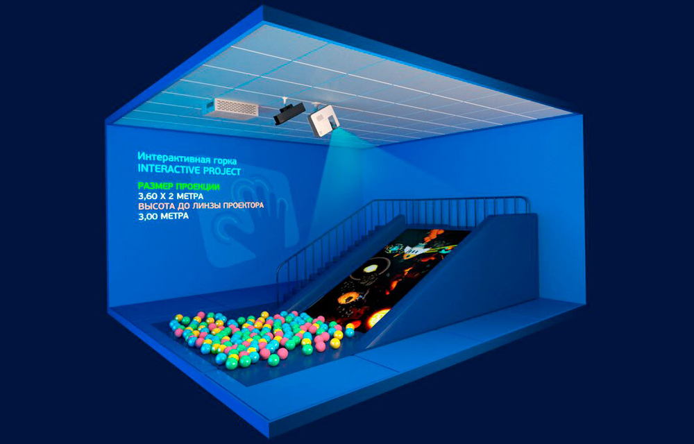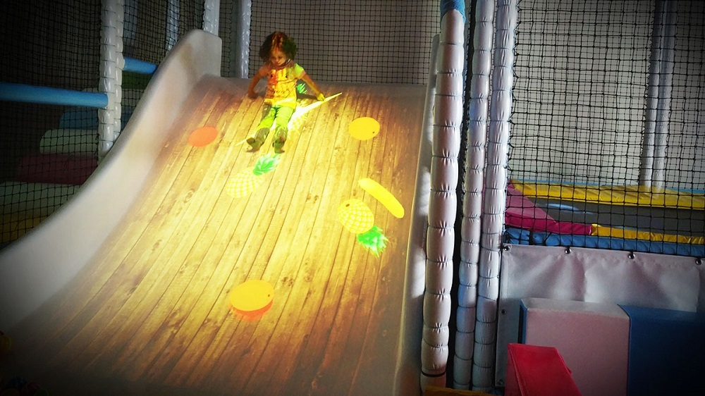 Оборудование проецирует изображение на наклонную поверхность, горку. Дети скатываются по горке с красочной интерактивной анимацией и музыкальным сопровождением. Система распознаёт движение, и на поверхности горки появляются волшебные интерактивные эффекты.