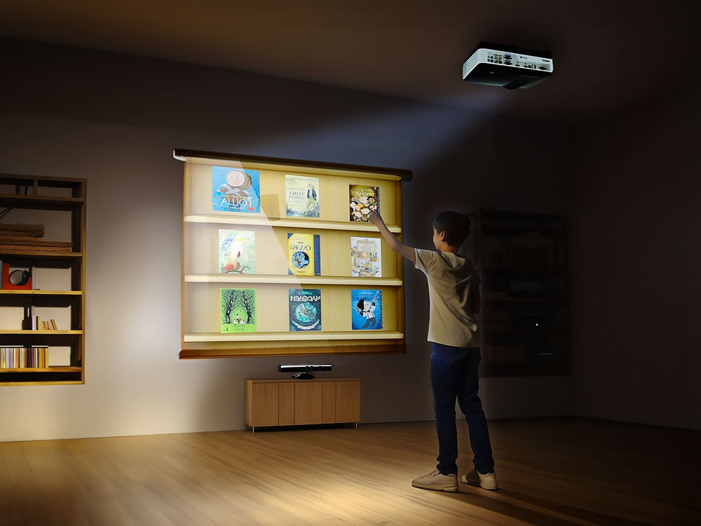 Проекционная инсталляция с уникальными 3D книжными изданиями. Когда человек проходит мимо, книги на виртуальной полке оживают. Любой посетитель, управляя движениями, может выбрать и прочитать понравившийся экземпляр книги.