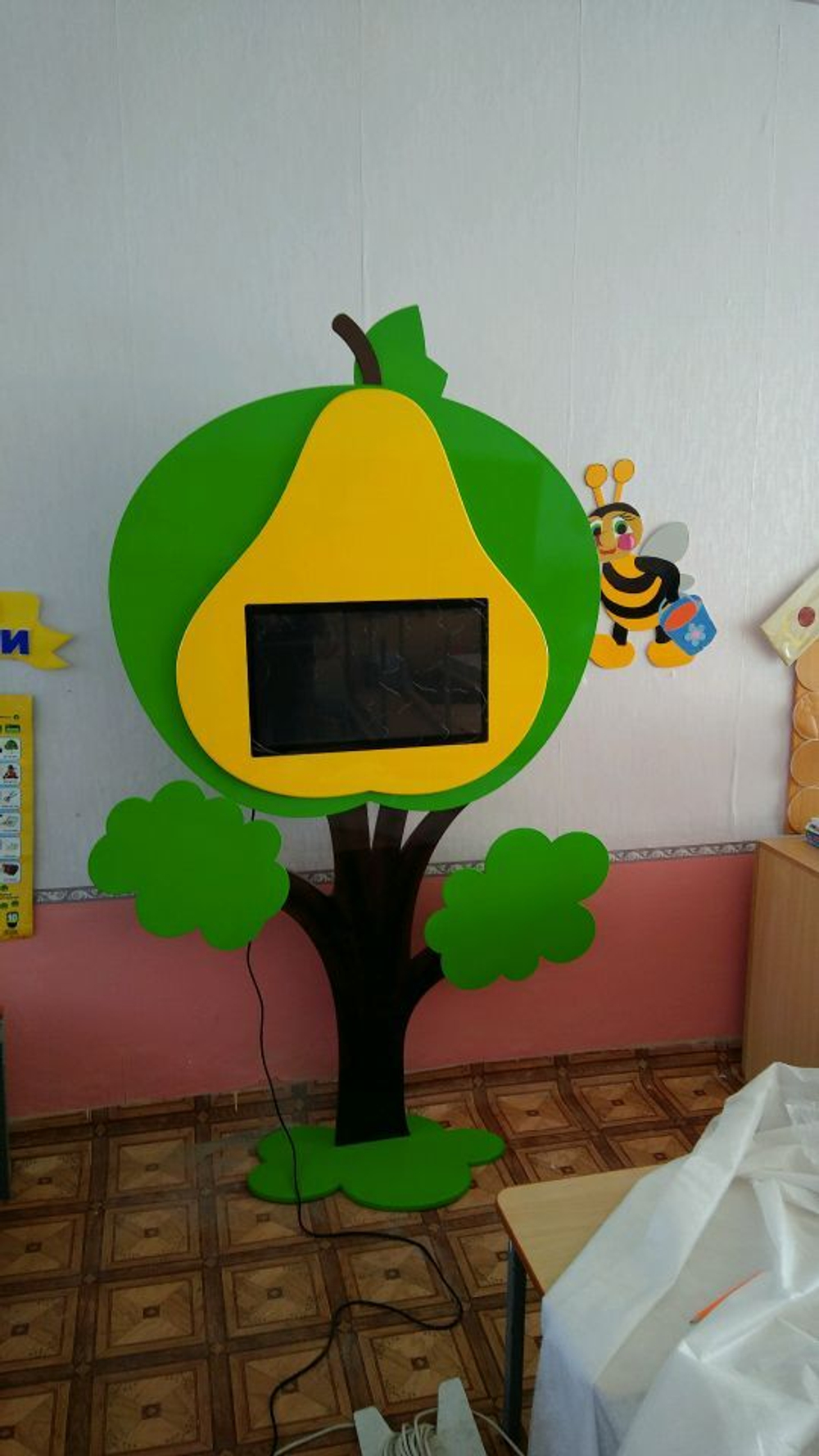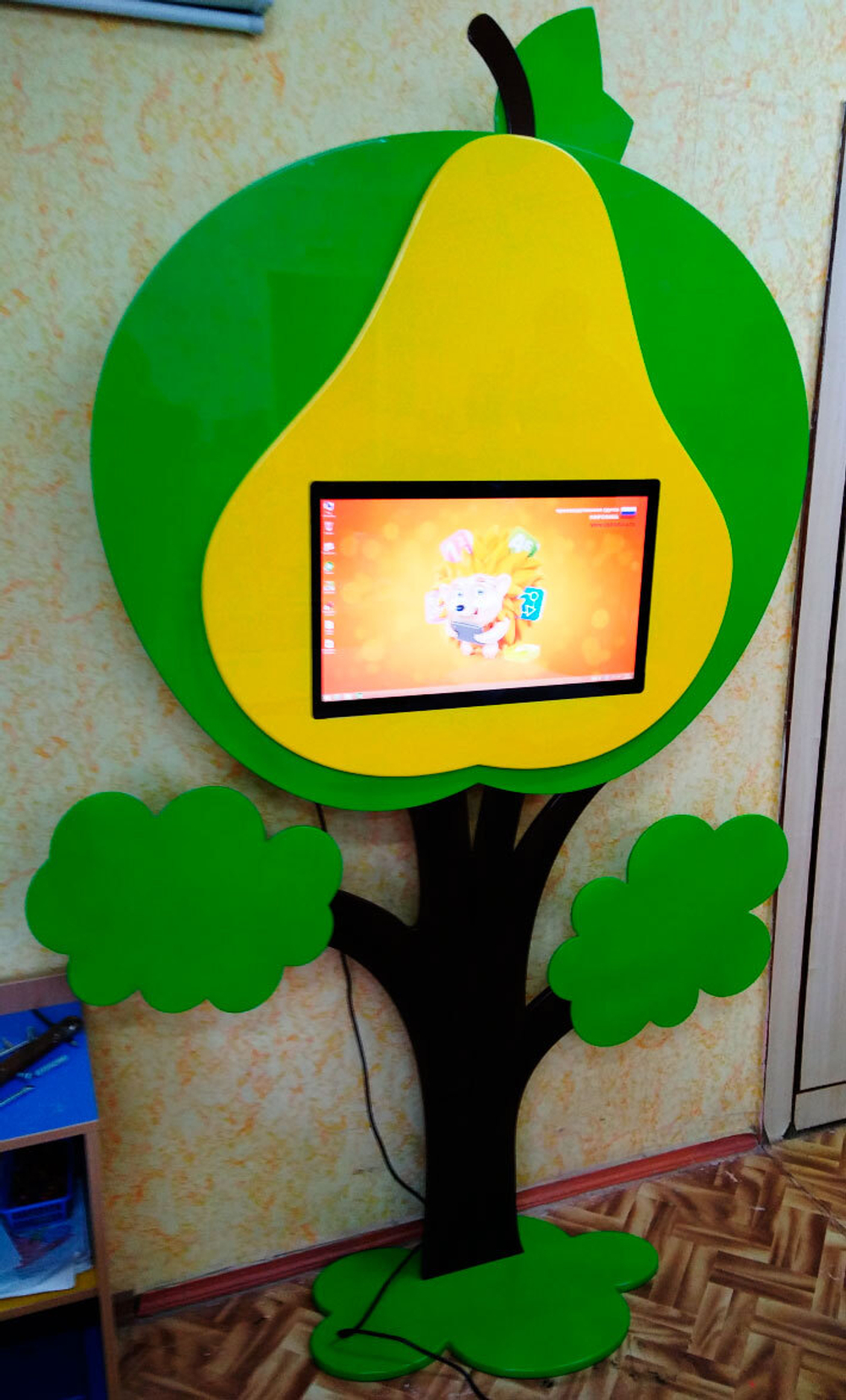 Интерактивная панель представляет собой пристенный многофункциональный сенсорный комплекс, декоративный корпус которого выполнен в виде груши. Сенсорная панель оснащена встроенным ПК с предустановленным развивающим и обучающим пакетом программ. Поверхность экрана реагирует как на управление пальцами, так и на специализированный стилус (есть в комплекте).